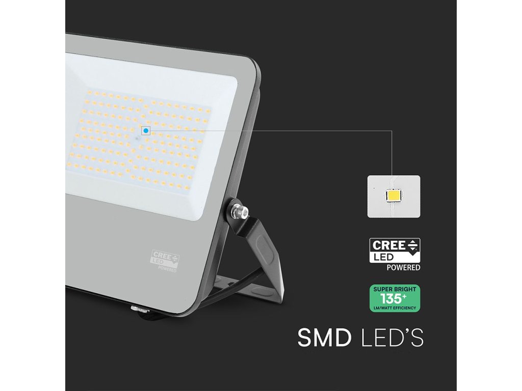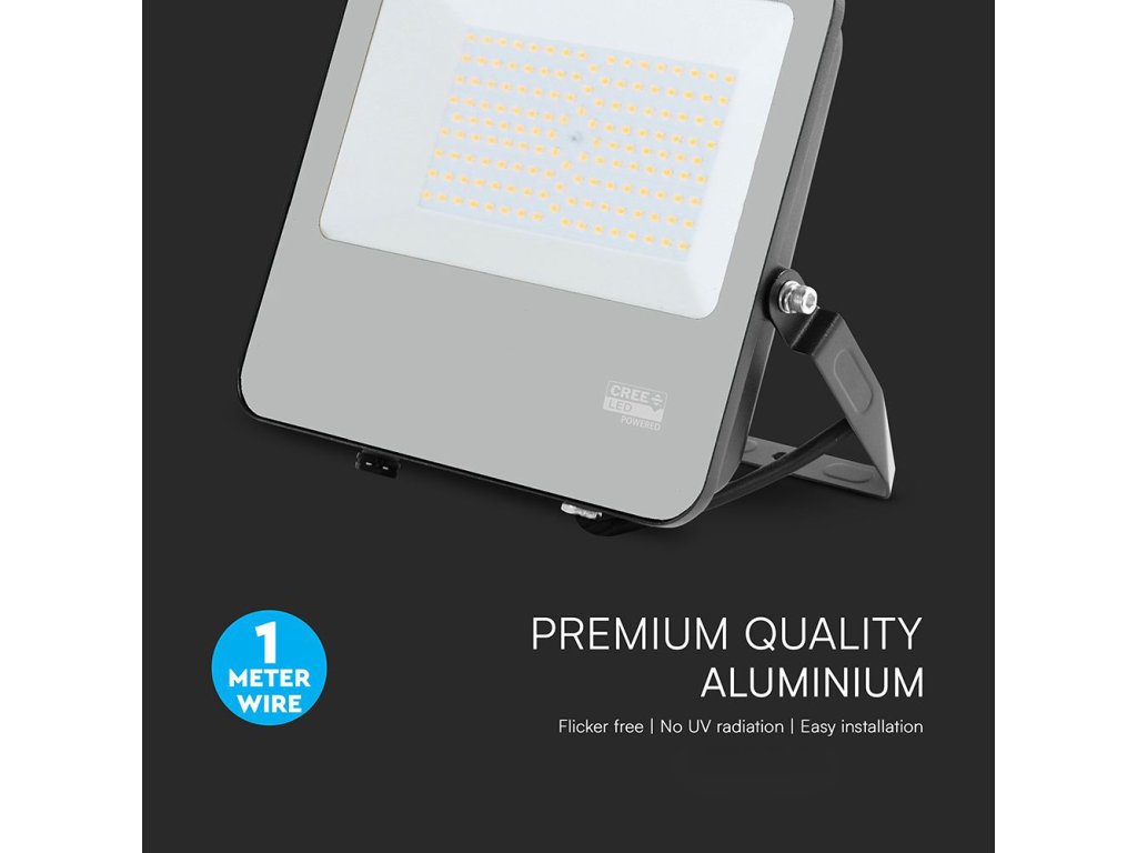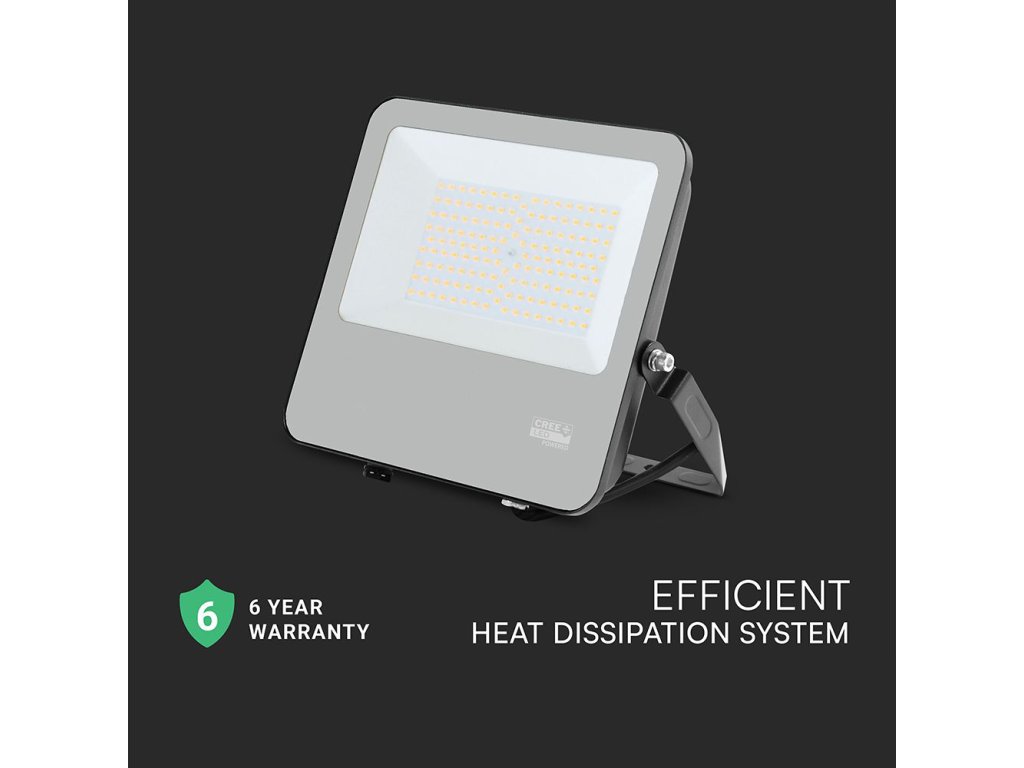Robustné telo z prémiového hliníka s moderným odvodom tepla garantuje dlhú životnosť až 30 000 hodín a stabilnú prevádzku aj v náročných podmienkach. Povrchová úprava odolná proti korózii a krytiu IP65 chráni reflektor pred prachom, dažďom aj vlhkosťou, takže je ideálnou voľbou pre fasády budov, priemyselné areály, športoviská, parkoviská, reklamné plochy alebo komerčné priestory. Matné predné sklo zaisťuje rovnomerné rozptýlenie svetla a znižuje nežiaduce oslnenie.