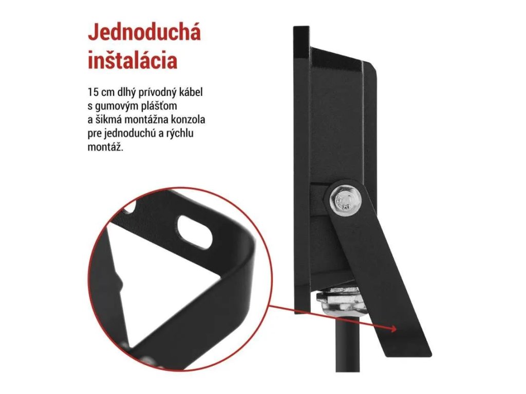 Inštalácia je veľmi jednoduchá – skosená montážna konzola umožňuje nastaviť optimálny sklon svetla a prívodný kábel s gumovým plášťom s dĺžkou 15 cm zaisťuje bezpečné a rýchle pripojenie do siete. Reflektor sa po zapnutí okamžite rozsvieti na plný výkon a vďaka modernej LED technológii pracuje bez blikania.