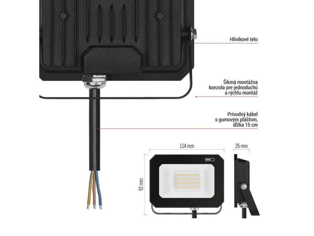 Reflektor má tenké hliníkové telo v elegantnej čiernej farbe, ktoré výborne odvádza teplo a chráni vnútorné komponenty pred prehriatím. Predný sklenený difúzor zaisťuje rovnomerné rozloženie svetla v širokom uhle 120°, takže osvetlený priestor je jasný a bez tieňov. Vďaka krytiu IP65 je reflektor odolný voči dažďu aj prachu a je vhodný na celoročné použitie v exteriéri.