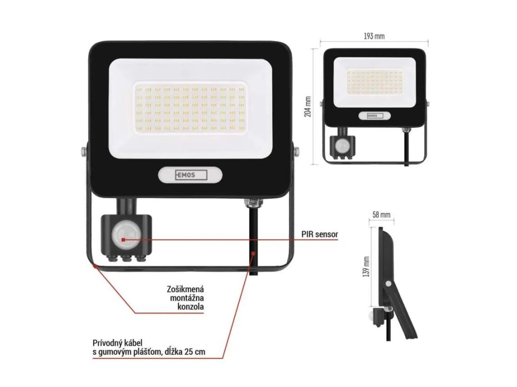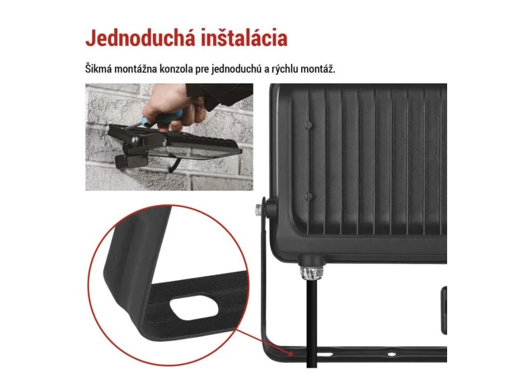 Súčasťou konštrukcie je praktická šikmá montážna konzola, vďaka ktorej možno jednoducho nastaviť presný smer svietenia a upevniť reflektor na fasádu, stenu alebo iný povrch bez zložitých úprav. Na rýchle zapojenie slúži prívodný kábel s gumovým plášťom s dĺžkou 25 cm, ktorý zabezpečuje bezpečné a spoľahlivé pripojenie. Reflektor sa po zapnutí okamžite rozsvieti na plný výkon, pracuje bez blikania a vďaka modernej LED technológii výrazne znižuje prevádzkové náklady.