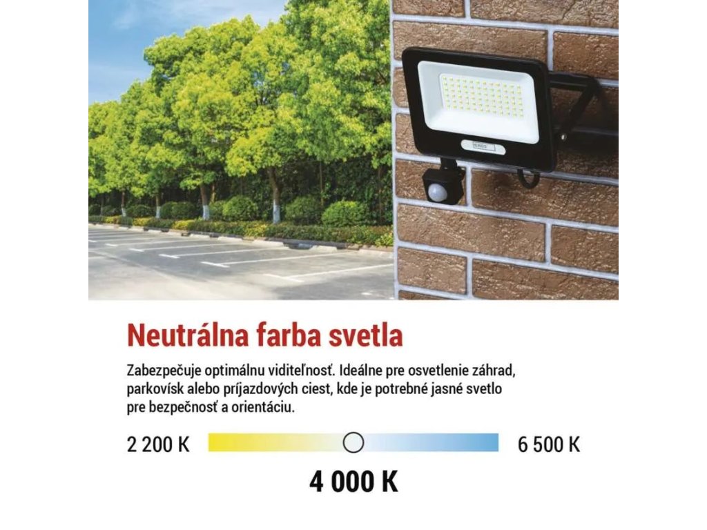LED reflektor s výkonom 50 W prináša vysokú svetelnú účinnosť 100 lm/W a poskytuje silné a zároveň úsporné osvetlenie pre vonkajšie aj vnútorné použitie. Svetelný tok 5 000 lm spoľahlivo osvetlí fasády domov, príjazdové cesty, záhrady, garáže aj menšie firemné priestory. Neutrálna biela farba svetla s teplotou 4 000 K zabezpečuje prirodzenú viditeľnosť a rovnomerné osvetlenie bez rušivých farebných tónov, takže je vhodná na orientáciu, bezpečný pohyb aj prácu.