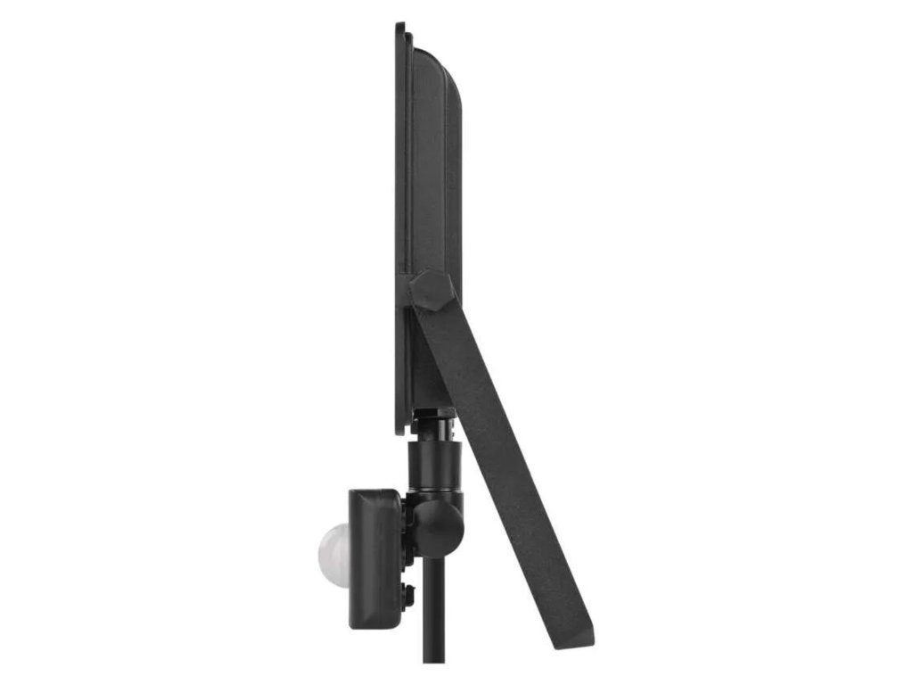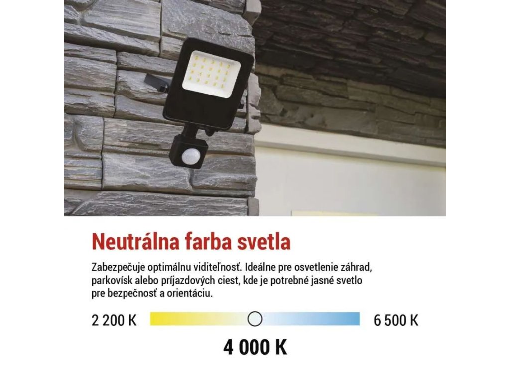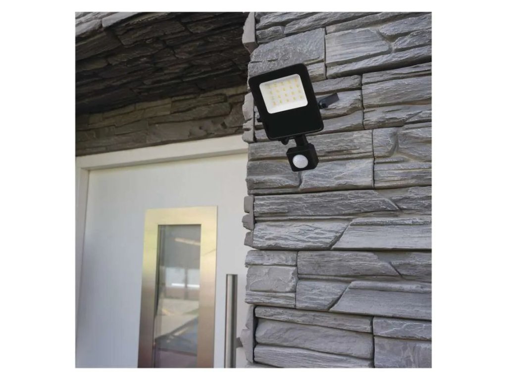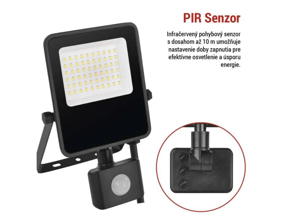Reflektor je vybavený infračerveným pohybovým senzorom, ktorý automaticky rozsvieti svetlo pri detekcii pohybu a po určitej dobe ho opäť vypne. Uhol záberu senzora dosahuje 120° a reaguje na pohyb až do vzdialenosti 10 metrov, čo zaisťuje spoľahlivé pokrytie širokého priestoru. Doba svietenia je nastaviteľná, vďaka čomu je možné prispôsobiť prevádzku reflektora konkrétnym potrebám a zbytočne neplytvať energiou.