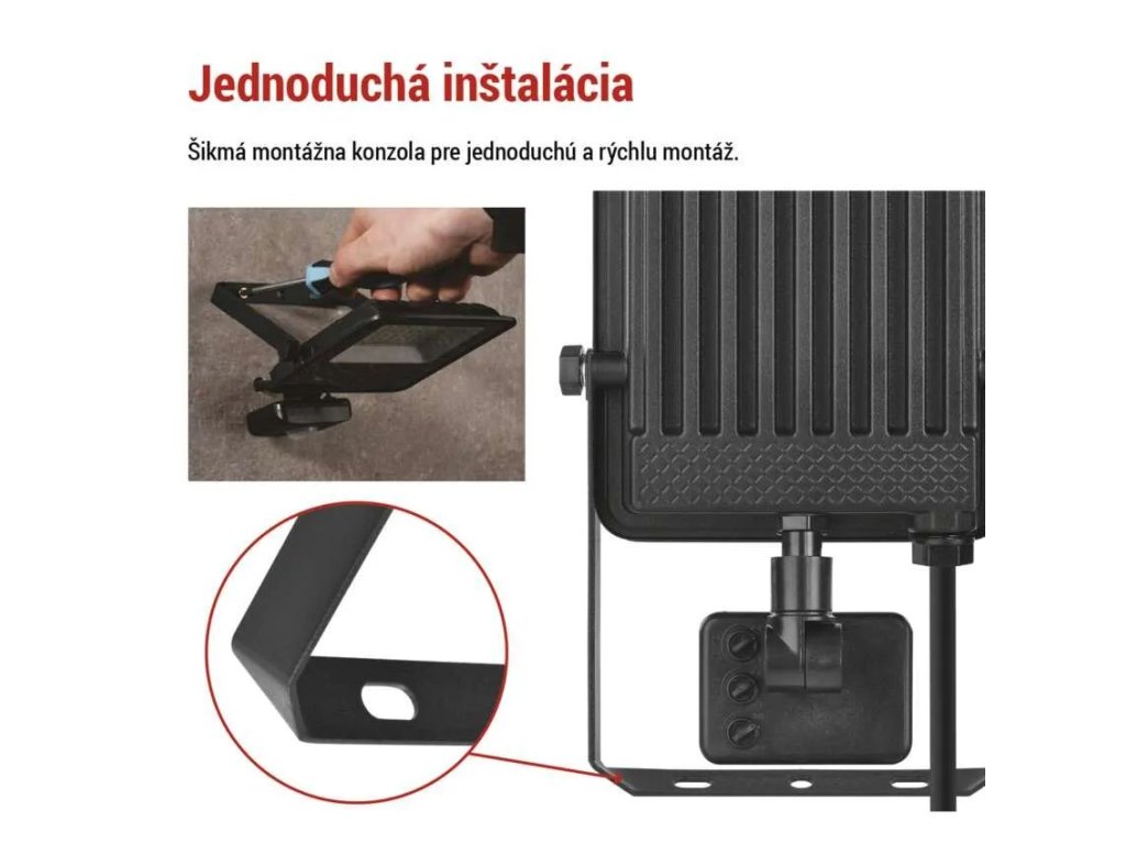 Reflektor je ihneď po zapnutí na plnom výkone, bez nepríjemného blikania. Hodí sa nielen pre stále osvetlenie, ale aj ako bezpečnostné svetlo, ktoré je možné zapojiť do systému s pohybovým čidlom. Jeho kompaktné rozmery a zošikmená montážna konzola umožňujú jednoduchú inštaláciu a flexibilné nastavenie uhla svietenia podľa potreby. Oceľová montážna konzola je pripravená na rýchle uchytenie – stačí nasadiť a pripojiť do siete.