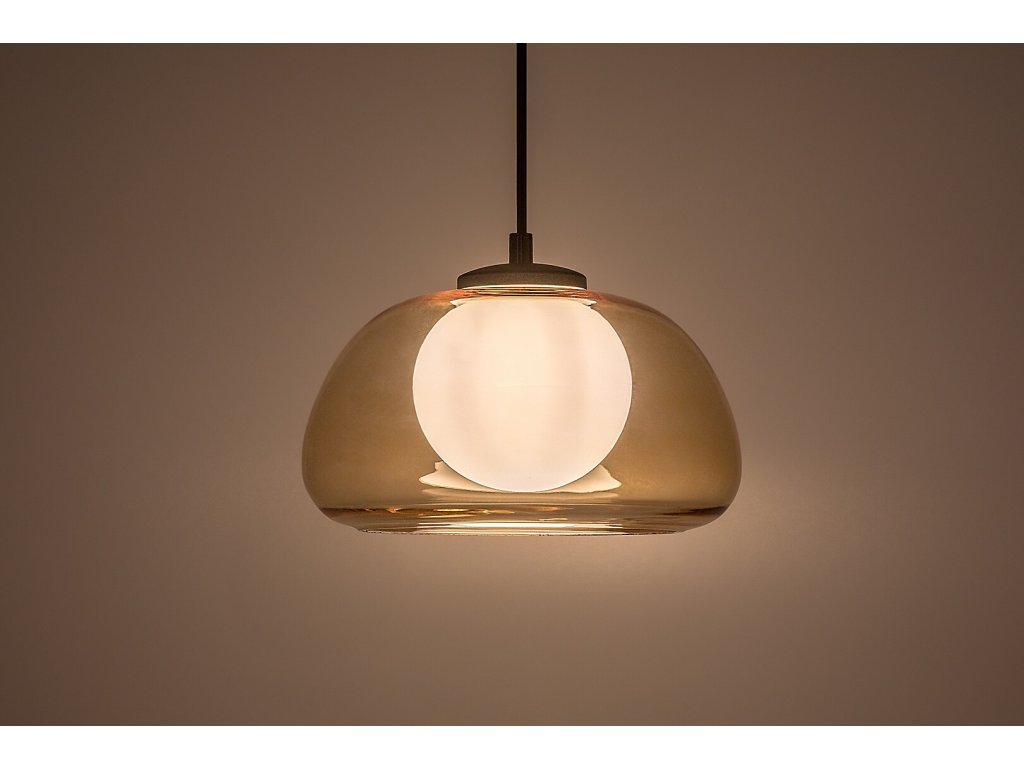 Vonkajšie sklenené tienidlo s jemne zakrivenými líniami prepúšťa svetlo mäkko a rovnomerne, zatiaľ čo vnútorné guľové tienidlo z bieleho skla čiastočne clonia žiarovku a zabraňuje oslneniu. Výsledkom je príjemné, pokojné svetlo vhodné na každodenné používanie aj večerné atmosférické osvetlenie. Čierna kovová konštrukcia a textilný kábel podčiarkujú moderný charakter svietidla a zároveň vytvárajú vizuálny kontrast ku sklu.