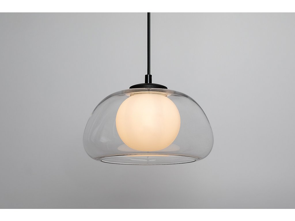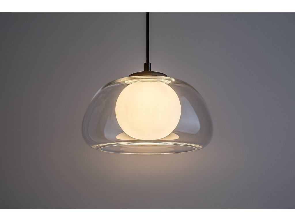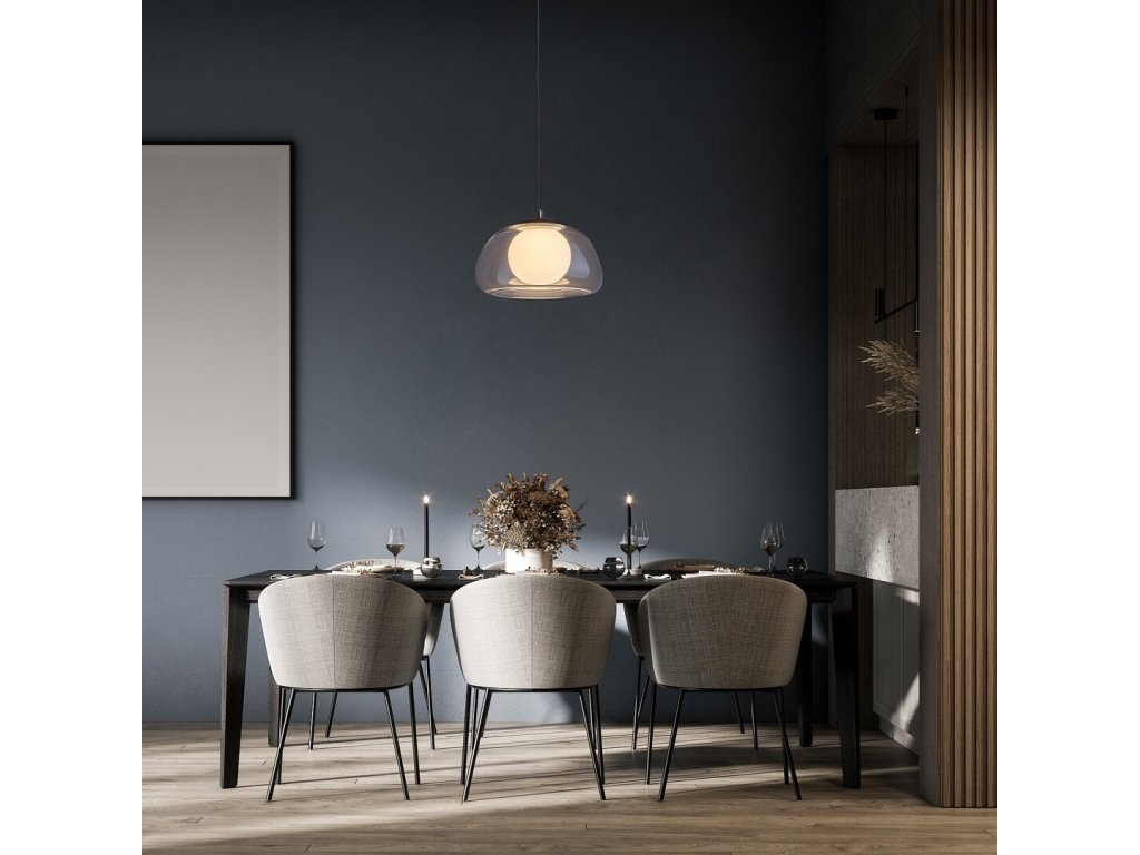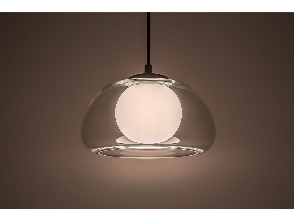 Vonkajšie tienidlo z číreho skla s jemne zakrivenými líniami necháva vyniknúť vnútornému guľovému tienidlu z bieleho skla, ktoré zároveň čiastočne cloní žiarovku a zabraňuje nepríjemnému oslneniu. Svetlo je vďaka tomu rovnomerne rozptýlené, príjemné pre oči a vhodné na bežné každodenné svietenie aj na pokojnejšiu večernú atmosféru. Priehľadné sklo dodáva svietidlu ľahkosť a vizuálnu čistotu, ktorá v interiéri nepôsobí rušivo ani v menších priestoroch.