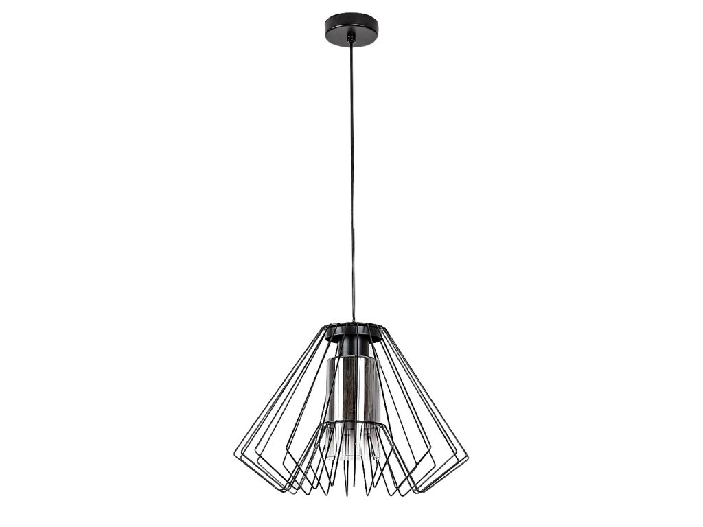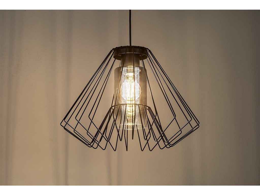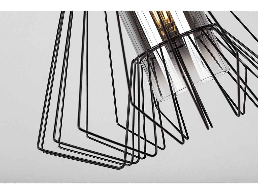 Závesné svietidlo Emerencia zaujme výrazným industriálnym dizajnom, ktorý kombinuje čiernu kovovú konštrukciu s dekoratívnym dymovým sklom. Otvorené drôtené tienidlo v tvare písmena A pôsobí ľahko a technicky čisto, zatiaľ čo valcové vnútorné tienidlo z dymového skla zjemňuje svetlo a vytvára príjemnú, jemne tlmenú atmosféru.