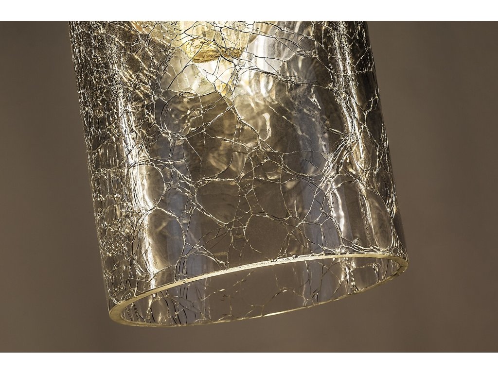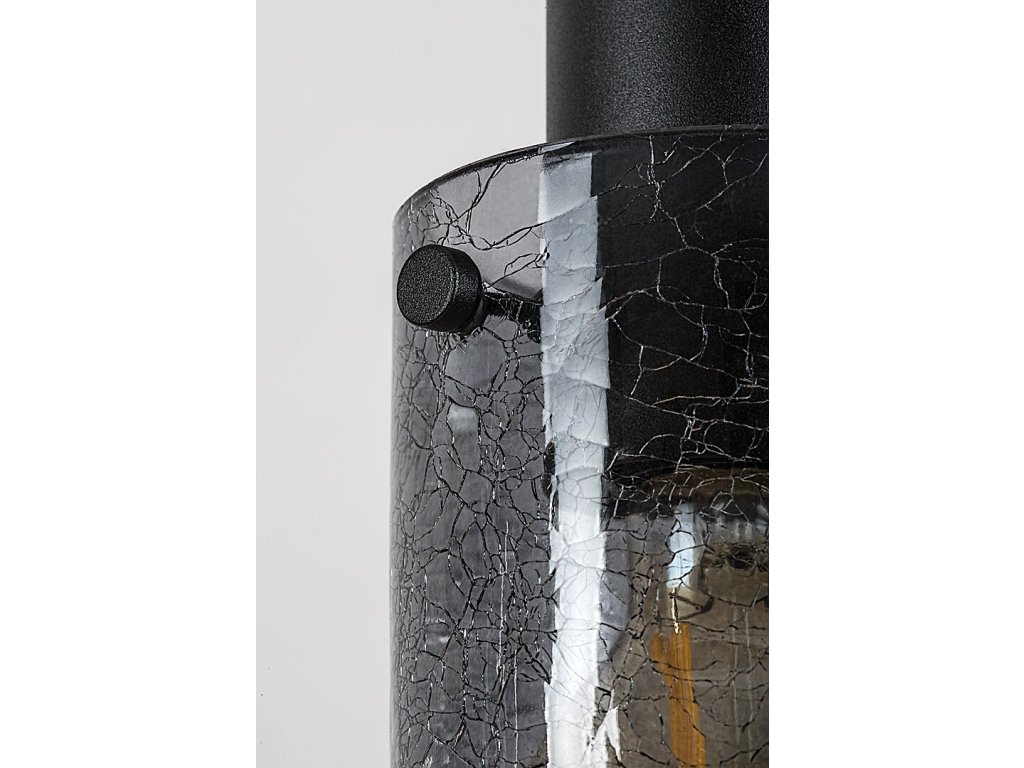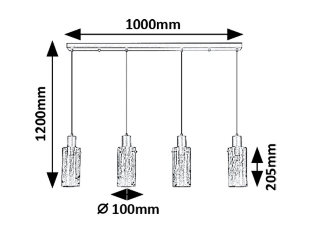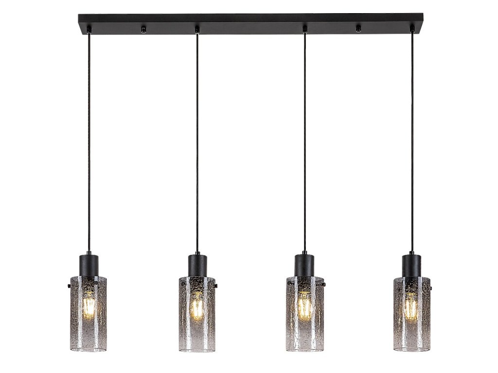 Konštrukciu svietidla tvorí dlhá obdĺžniková stropná základňa v čiernom vyhotovení, z ktorej sú v jednej línii zavesené štyri samostatné svetelné body v rovnakej výške. Každý záves je osadený valcovým tienidlom z dymového skla s jemne štruktúrovaným povrchom, ktorý svetlo príjemne zjemňuje a vytvára atraktívny svetelný efekt. Priehľadné tienidlo zároveň ponecháva viditeľnú samotnú žiarovku, vďaka čomu je táto varianta ideálna na použitie dizajnových filamentových alebo tvarovo výrazných žiaroviek.