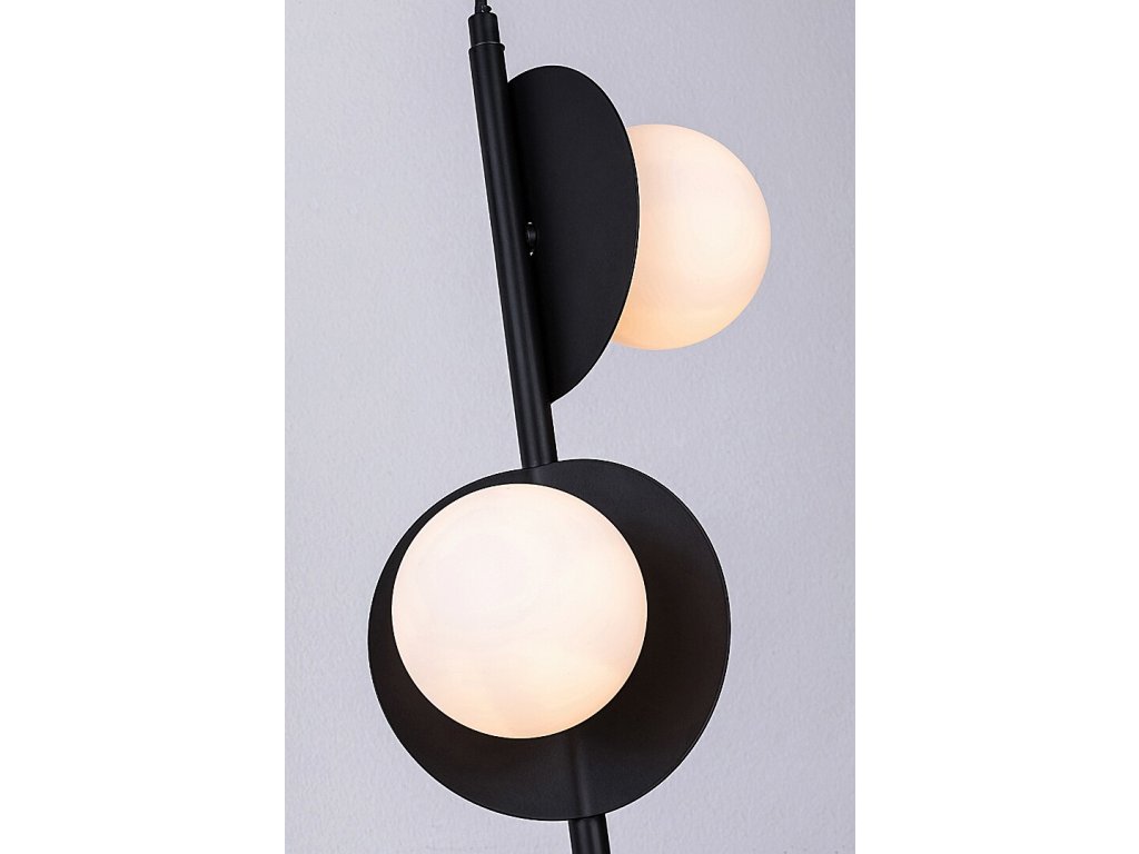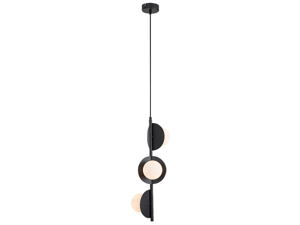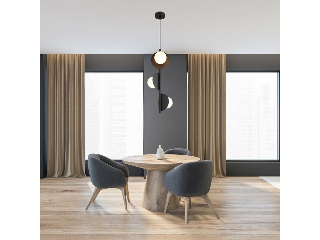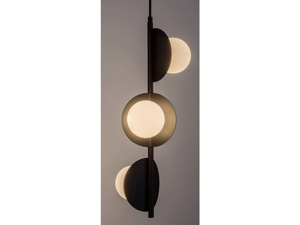 Tri samostatné svetelné prvky sú usporiadané vertikálne a každý z nich smeruje iným smerom, vďaka čomu svetlo prirodzene vyplní celý priestor a nepôsobí jednostranne. Kombinácia plochých kruhových kovových prvkov a sférických tienidiel dodáva svietidlu moderný, jemne industriálny charakter, ktorý vynikne v minimalistických aj výraznejších interiéroch.