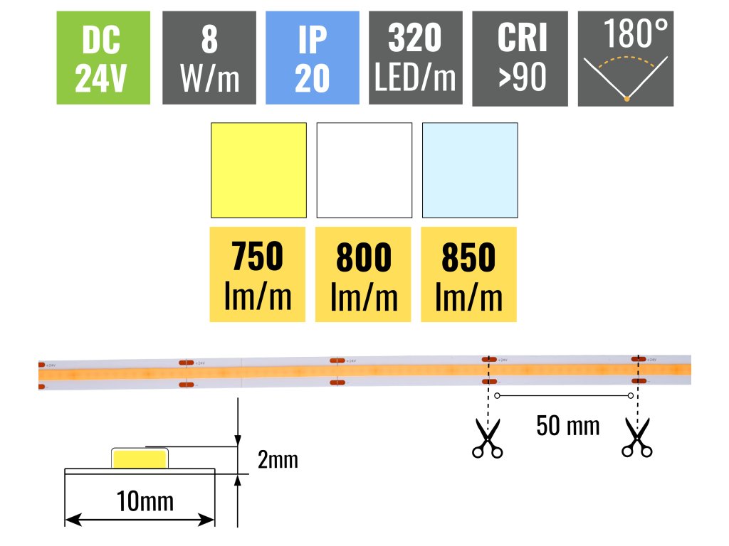 Z výkonu 8W/m pásik vyprodukuje až 850lm/m. Hustota LED diód je 320ks/m, opasok vďaka tomu svieti rovnomerne po celej svojej dĺžke. Tento pásik je potrebné nalepiť do hliníkovej lišty z dôvodu odvodu tepla z LED diód. Všetky naše pásky sú vybavené samolepiacou fóliou 3M 300LSE, ktorá skvele priľne k podkladu. Ten musí byť hladký a je potrebné ho pred lepením poriadne odmastiť.