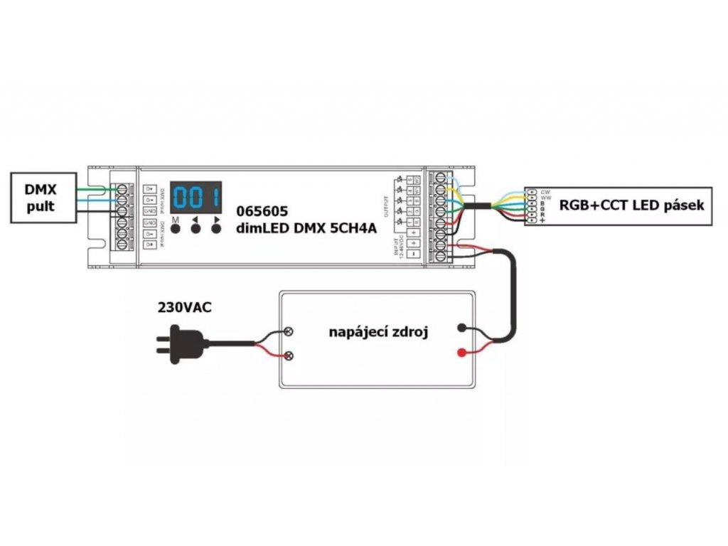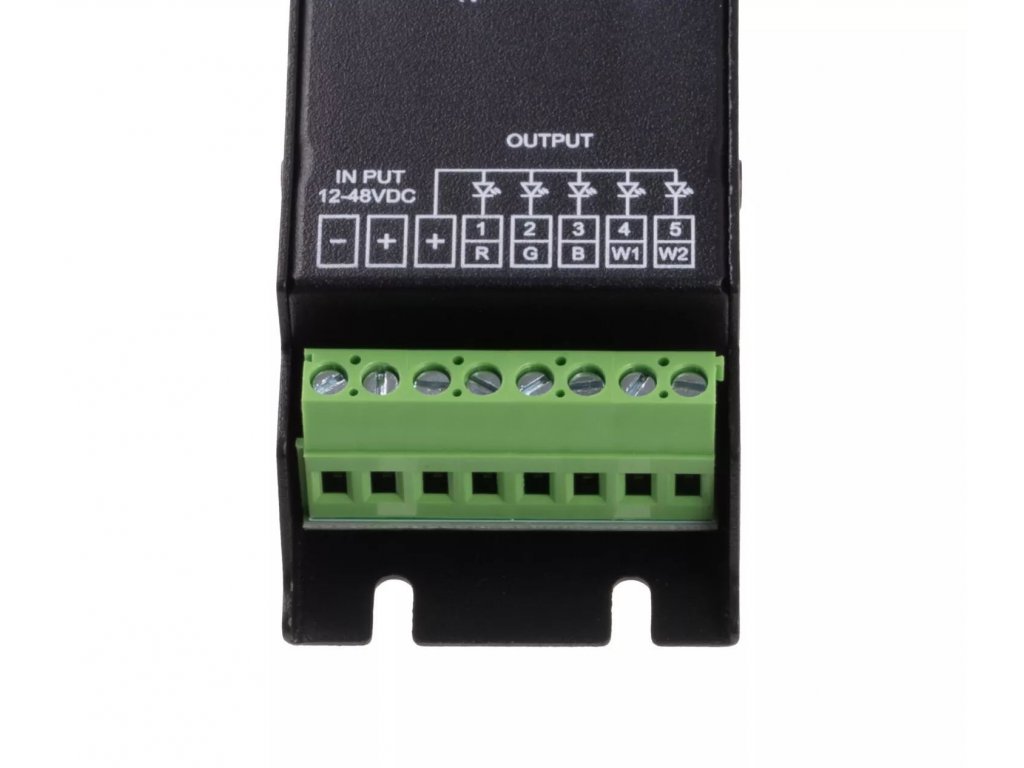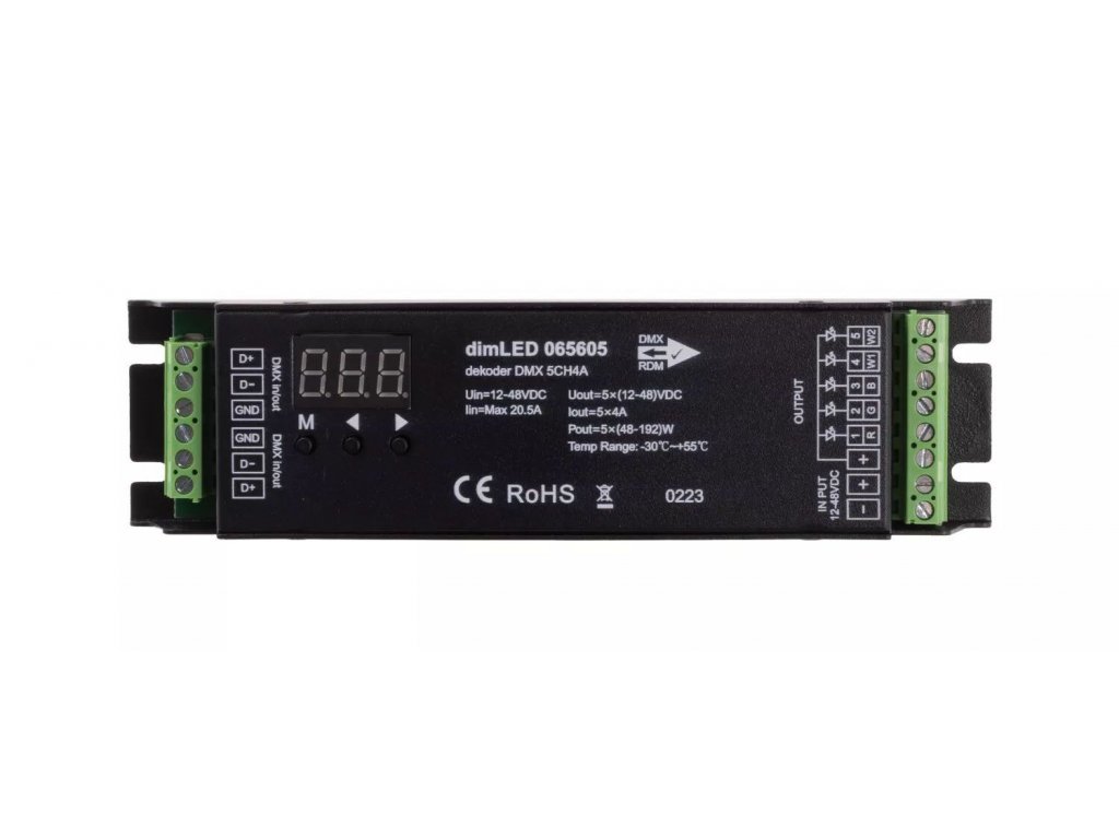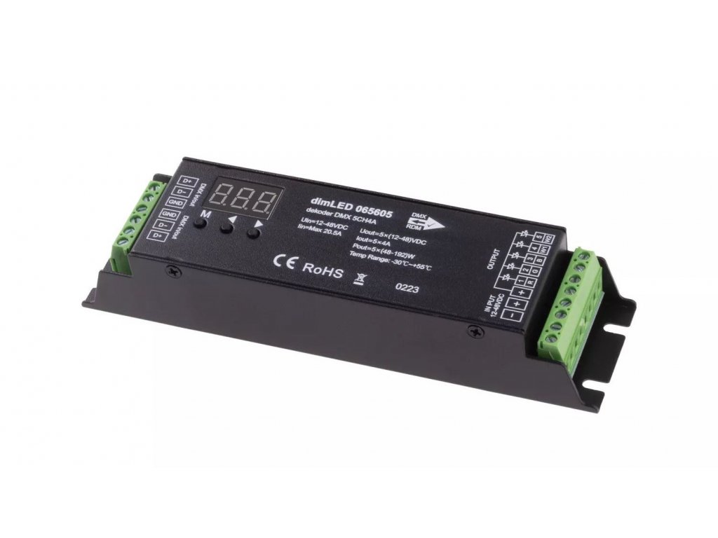 DMX dekodér je 5-kanálový prevodník určený pre ovládanie LED systémov so spoločnou anódou pomocou DMX konzoly medzi ktoré patria napríklad jednofarebné, CCT, RGB, RGBW alebo RGBCCT LED pásiky.