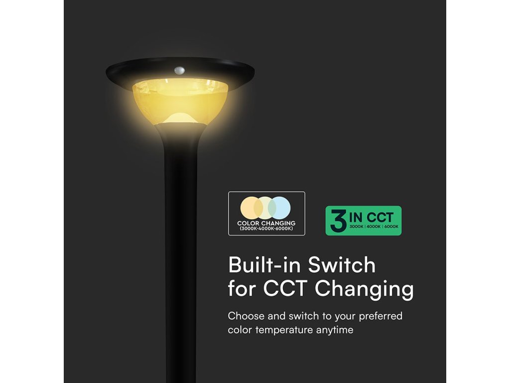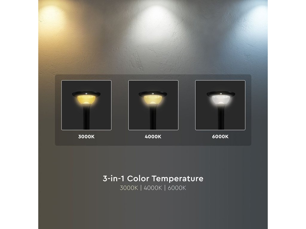 Teplotu svetla je možné jednoducho meniť priamo na tele svietidla alebo pomocou priloženého diaľkového ovládača. K dispozícii sú tri farby svietenia – teplá (3000 K), neutrálna denná (4000 K) a studená biela (6000 K). Jednotlivé odtiene je možné prepínať krátkym či dlhým stlačením tlačidla, pričom funkcia pamäte uchováva posledné zvolené nastavenie. Vďaka vyžarovaciemu uhlu 360° je svetlo rovnomerne rozptýlené do všetkých smerov, čo je vhodné najmä pre voľné priestranstvá a cestné osvetlenie.