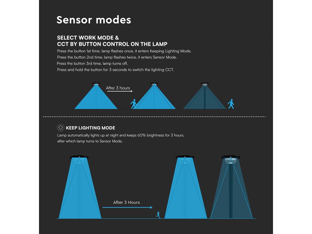 Integrovaný PIR senzor detekuje pohyb v dosahu až 8 metrov v uhle 120° a automaticky spína svetlo podľa zvoleného režimu. Svietidlo ponúka plne automatický senzorový režim aj režim trvalého svietenia s postupným prechodom do úsporného módu. Pre väčší komfort je možné pomocou ovládača vyberať intenzitu svietenia aj časový interval osvetlenia, a to na vzdialenosť až 5 metrov. Úsporná prevádzka predlžuje výdrž batérie a zaisťuje spoľahlivé fungovanie aj počas menej slnečných dní.