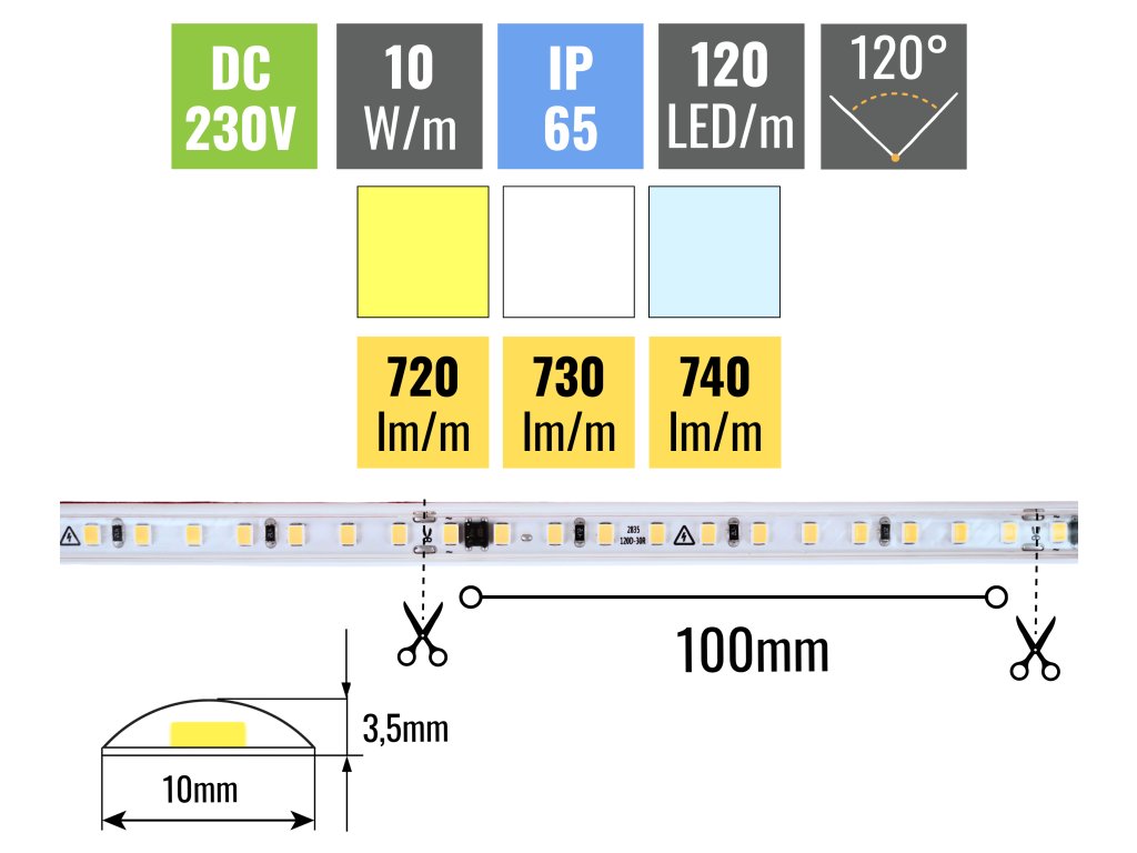 LED pásik 230V predstavuje praktické riešenie pre vnútorné aj vonkajšie osvetlenie a vďaka krytiu IP65 zvládne bežné vonkajšie podmienky. Výnimkou sú konce a spoje, ktoré je vždy potrebné ošetriť silikónom, aby bola zachovaná ochrana proti vlhkosti. Napája sa priamo zo siete 230V, takže nevyužíva samostatný napájací zdroj. Usmerňovacie mostíky sú integrované priamo na plošnom spoji, čo zjednodušuje inštaláciu – na pripojenie preto stačí zakúpiť originálny napájací kábel.