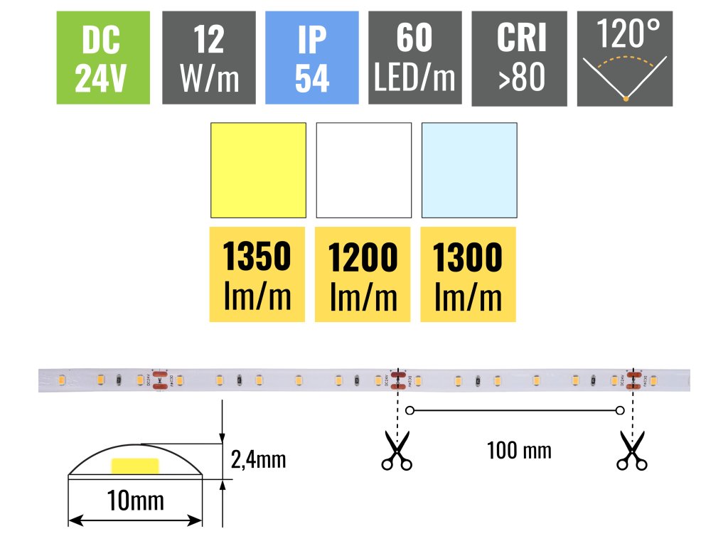 Z výkonu 12W/m pásik vyprodukuje až 1300lm/m. Hustota LED diód je 60ks/m, opasok vďaka tomu svieti rovnomerne po celej svojej dĺžke. Tento pásik je potrebné nalepiť do hliníkovej lišty z dôvodu odvodu tepla z LED diód. Všetky naše pásky sú vybavené samolepiacou fóliou 3M 300LSE, ktorá skvele priľne k podkladu. Ten musí byť hladký a je potrebné ho pred lepením poriadne odmastiť.