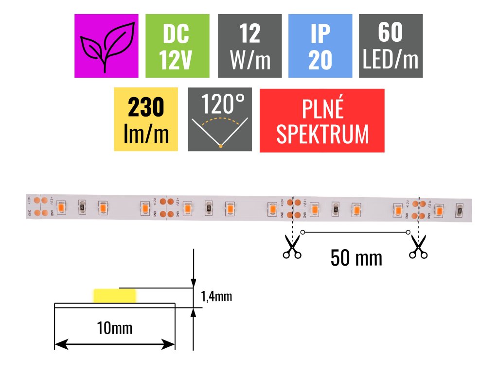 LED pásik 12W/m 12V bez krytia IP20 pre rastliny