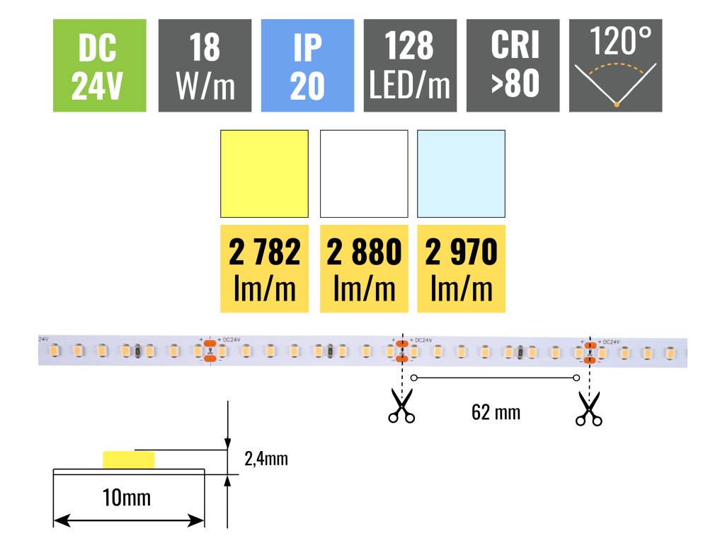 LED pásik s veľmi vysokou hodnotou svietivosti. Z výkonu 18W/m pásik vyprodukuje až 2970lm/m. Hustota LED diód je 128ks/m, opasok vďaka tomu svieti rovnomerne po celej svojej dĺžke. Tento pásik je potrebné nalepiť do hliníkovej lišty z dôvodu odvodu tepla z LED diód. Všetky naše pásky sú vybavené samolepiacou fóliou 3M 300LSE, ktorá skvele priľne k podkladu. Ten musí byť hladký a je potrebné ho pred lepením poriadne odmastiť.
