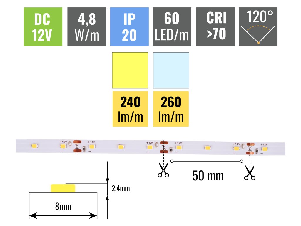 Z výkonu 4,8W/m pásik vyprodukuje až 210lm/m. Hustota LED diód je 60ks/m, opasok vďaka tomu svieti rovnomerne po celej svojej dĺžke. Tento pásik netreba lepiť do hliníkovej lišty, napriek tomu odporúčame tento krok zvážiť. Všetky naše pásky sú vybavené samolepiacou fóliou 3M, ktorá skvele priľne k podkladu. Ten musí byť hladký a je potrebné ho pred lepením poriadne odmastiť.