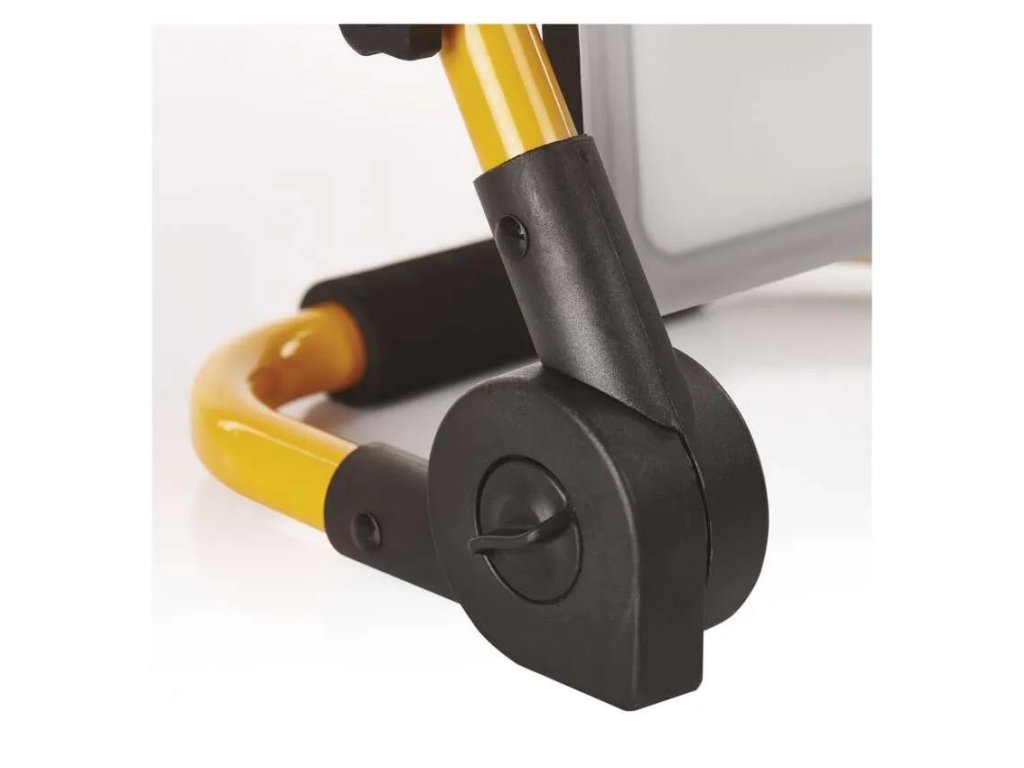 Dômyselné madlo s mäkkým úchopom, otočný a výklopný stojan a kompaktný skladací dizajn zaisťujú jednoduché nastavenie uhla svietenia a pohodlný transport. Súčasťou je odolný gumový napájací kábel H07RN-F s dĺžkou 1,5 m, vďaka ktorému je možné reflektor jednoducho pripojiť aj v náročnejšej prevádzke. Stupeň krytia IP44 umožňuje použitie aj v miernom daždi alebo prašnom prostredí a mechanická odolnosť IK10 zaručuje dlhú životnosť aj pri každodennom používaní.
