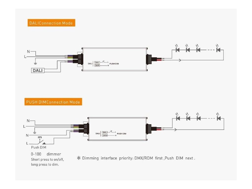 Ovládanie intenzity svetla je možné dvoma spôsobmi – pomocou štandardného DALI signálu, čo umožňuje jeho ľahké začlenenie do profesionálnych systémov riadenia osvetlenia, alebo cez tlačidlo (PUSH DIM), kde krátkym stlačením svetlo zapnete či vypnete a dlhým stlačením plynulo nastavíte požadovanú intenzitu. To poskytuje maximálnu flexibilitu, či už hľadáte jednoduché ovládanie, alebo plnú integráciu do chytrej inštalácie.