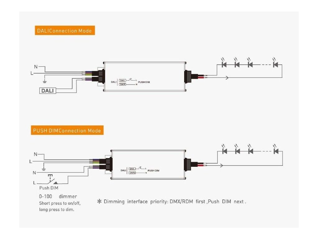 Ovládanie intenzity svetla je možné dvoma spôsobmi – pomocou štandardného DALI signálu, čo umožňuje jeho ľahké začlenenie do profesionálnych systémov riadenia osvetlenia, alebo cez tlačidlo (PUSH DIM), kde krátkym stlačením svetlo zapnete či vypnete a dlhým stlačením plynulo nastavíte požadovanú intenzitu. To poskytuje maximálnu flexibilitu, či už hľadáte jednoduché ovládanie, alebo plnú integráciu do chytrej inštalácie.