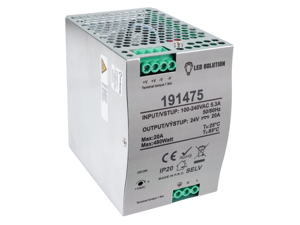 LED elektronický spínaný zdroj pre LED pásiky s výkonom 480W určený na vnútorné použitie. Konštrukcia umožňuje uchytenie na DIN lištu priamo do rozvádzača. Zdroj je vybavený tepelnou ochranou, ochranou proti skratu aj proti preťaženiu a ponúka možnosť manuálneho doladenia výstupného napätia v rozsahu ±10%.
