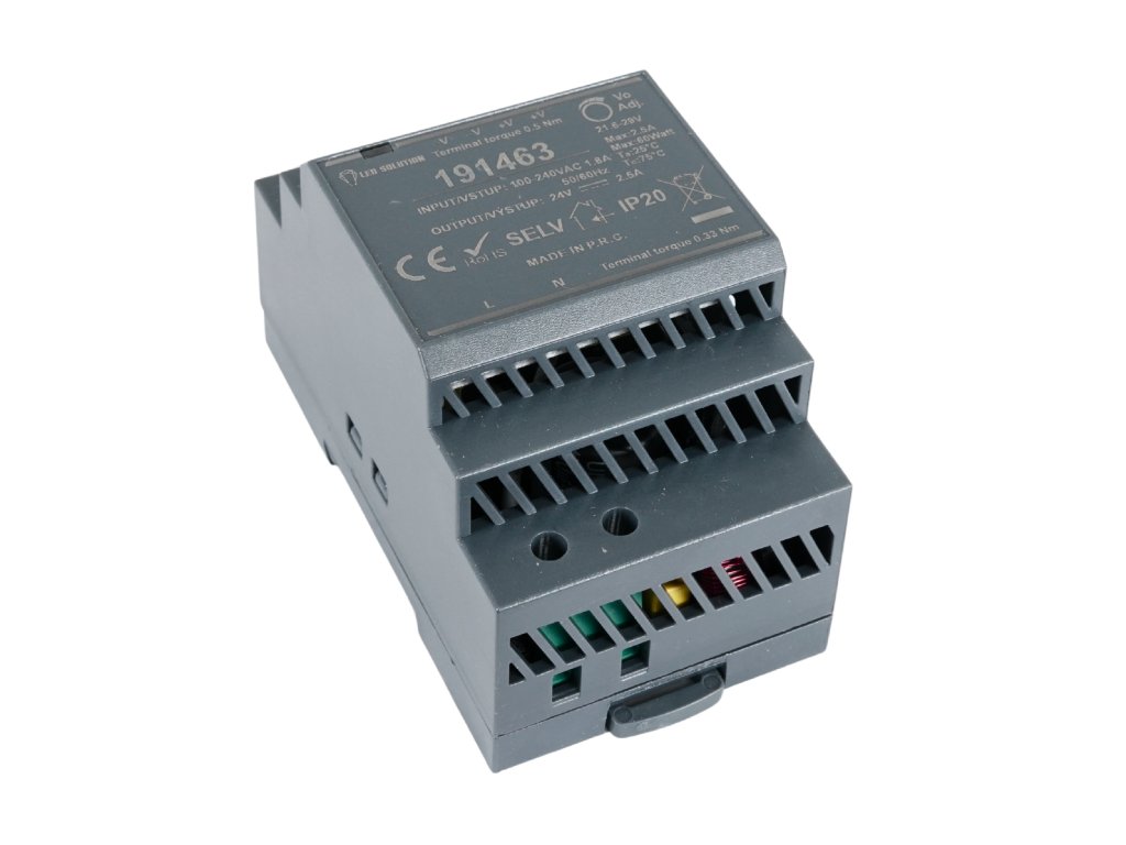 LED elektronický spínaný zdroj pre LED pásiky s výkonom 60W určený na vnútorné použitie. Konštrukcia umožňuje uchytenie na DIN lištu priamo do rozvádzača. Zdroj je vybavený tepelnou ochranou, ochranou proti skratu aj proti preťaženiu a ponúka možnosť manuálneho doladenia výstupného napätia v rozsahu ±10%.