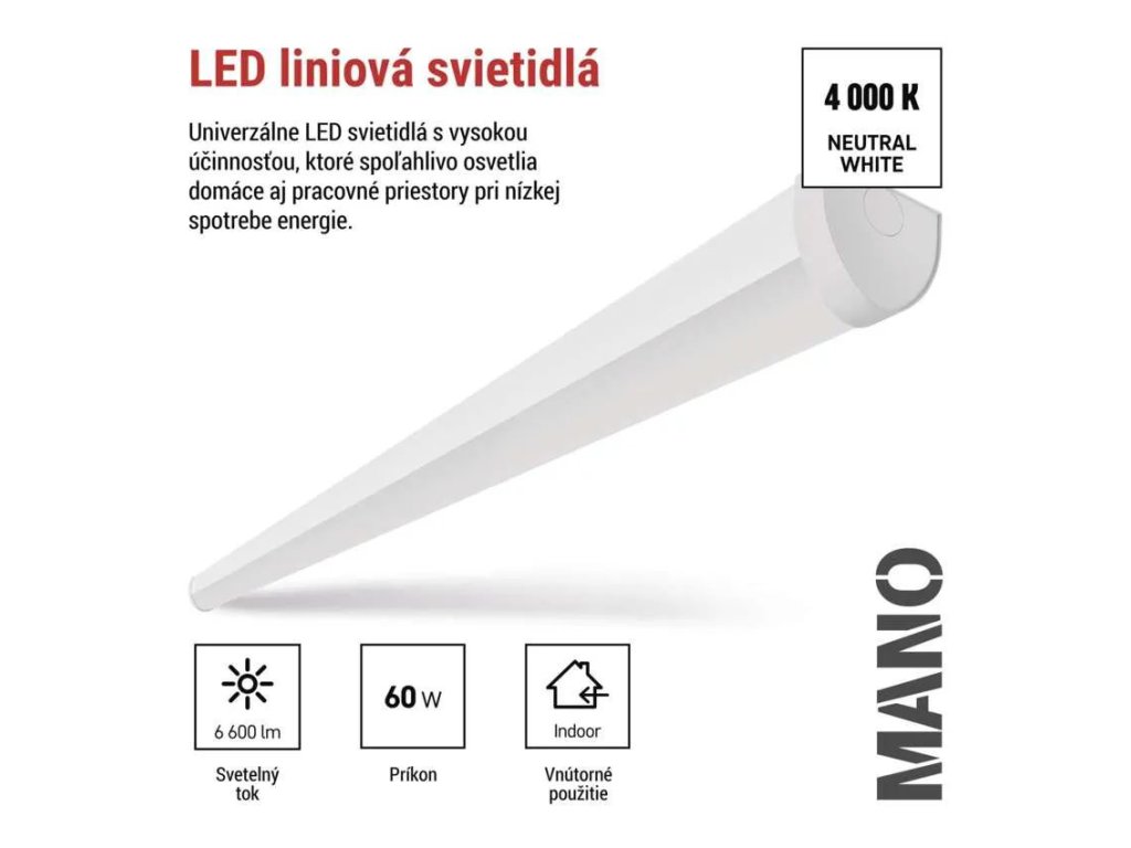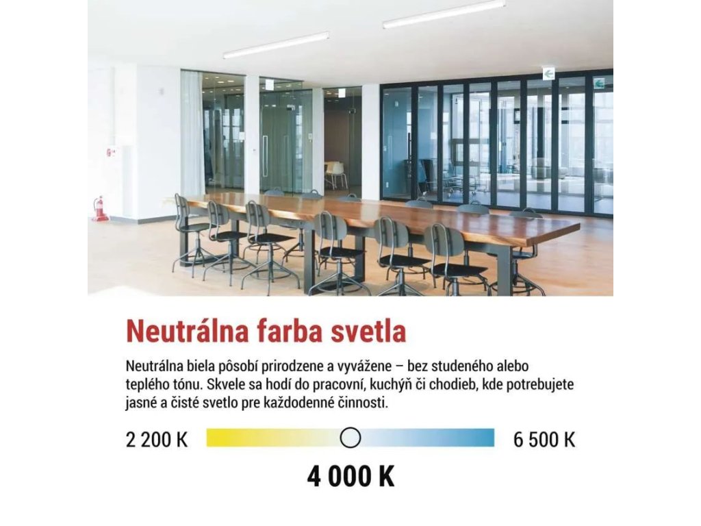 Integrovaný LED svetelný zdroj s výkonom 60 W vytvára jasné a prirodzené denné svetlo s teplotou 4 000 K, ktoré je ideálne na každodennú prácu. Svetelný tok 6 600 lúmenov zabezpečuje silné a rovnomerné osvetlenie bez nežiaducich tieňov. Svietidlo je osadené mliečnym difúzorom, ktorý jemne rozptyľuje svetlo po celej dĺžke a eliminuje oslnenie.