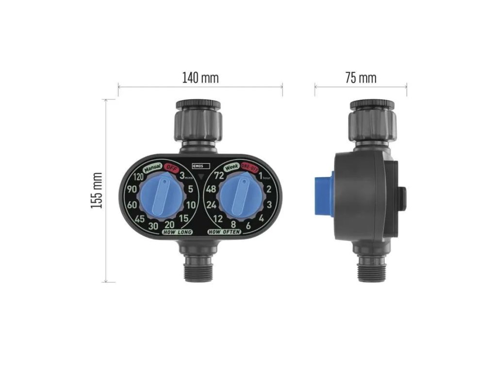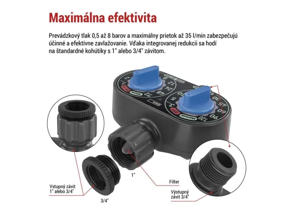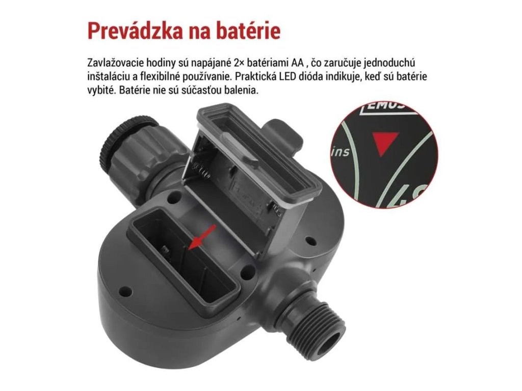 Zariadenie je vodeodolné s krytím IP54. Vďaka integrovanej redukcii sa jednoducho pripojí k bežným vodovodným kohútikom so závitom 1" alebo 3/4". Spoľahlivá prevádzka je zaistená až do tlaku 8 barov a prietoku 35 litrov za minútu, takže je ideálna pre zavlažovanie trávnikov, záhonov alebo skleníkov. Praktická LED kontrolka navyše upozorňuje na nízky stav batérie.