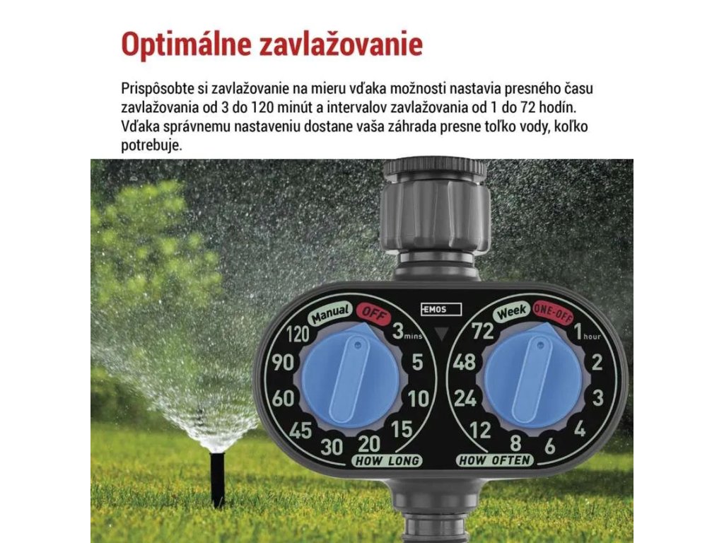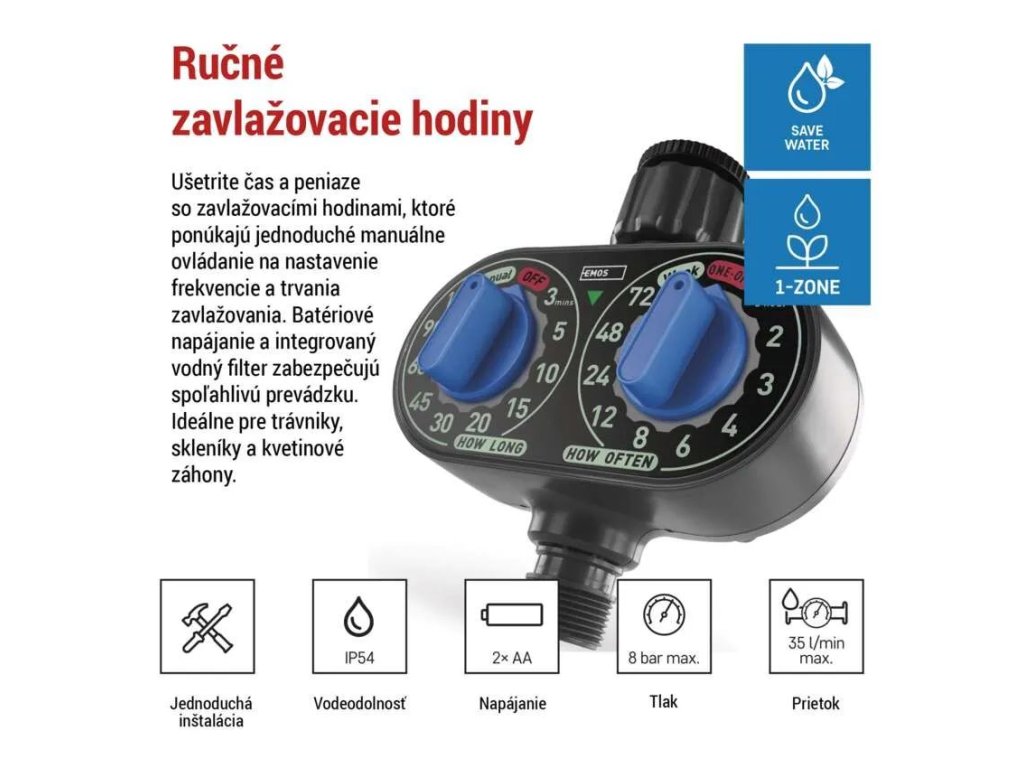 Užite si pohodlné a úsporné zavlažovanie s manuálnymi zavlažovacími hodinami, ktoré vám umožnia ľahko nastaviť, ako často a ako dlho sa má vaša záhrada zalievať. Stačí otočiť ovládacími prvkami a zvoliť požadovaný interval zavlažovania (od 1 do 72 hodín) a dobu jeho trvania (od 3 do 120 minút). Vďaka napájaniu na batérie a integrovanému vodnému filtru sú hodiny úplne samostatné a nevyžadujú žiadnu zložitú inštaláciu.