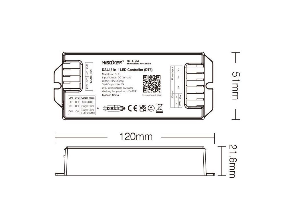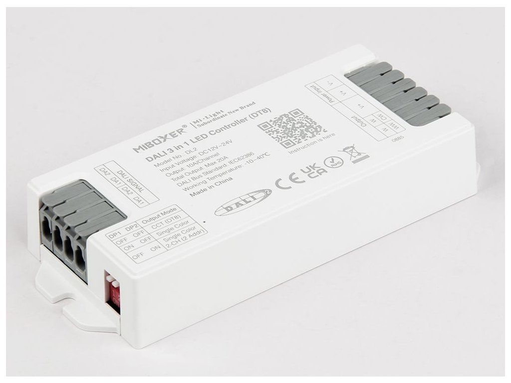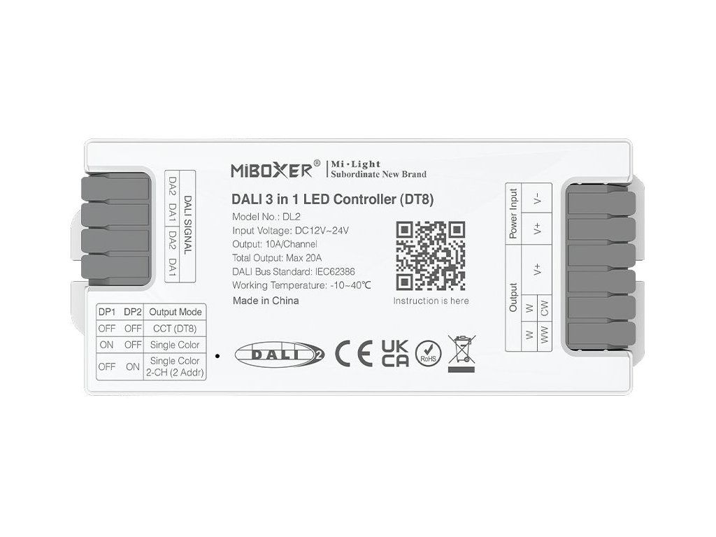 Prijímač pre LED produkty radu Mi-Light / MiBoxer, určený na ovládanie jednofarebných a CCT LED pásikov v systémoch riadenia osvetlenia DALI. Prijímač sa zapája medzi napájací zdroj a LED pásik a umožňuje zapínanie, vypínanie, plynulé stmievanie a pri CCT LED pásikoch aj reguláciu teploty bielej.