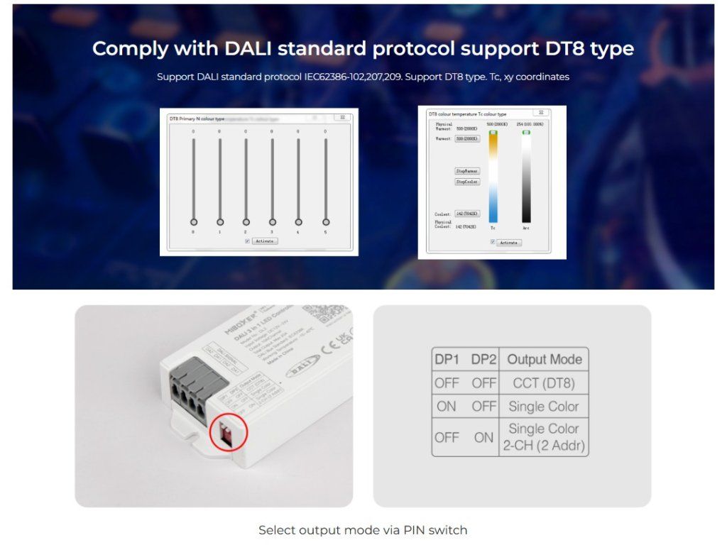V režime jednofarebného osvetlenia je možné využiť jeden alebo dva samostatne riadené výstupy (dual address). V CCT režime je riadenie realizované pomocou jedného DALI adresného bodu (DT8), ktorý umožňuje súčasnú reguláciu jasu aj teploty bielej.