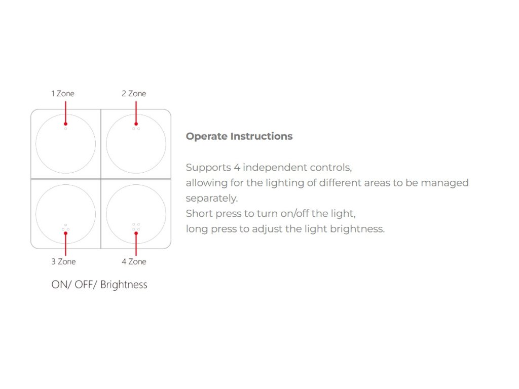 Ovládač je navrhnutý ako nástenný panel s moderným minimalistickým vzhľadom a je vhodný na domáce aj komerčné použitie. Vďaka bezdrôtovej komunikácii nie je potrebná priama viditeľnosť medzi ovládačom a prijímačom – prijímače môžu byť inštalované skryto, napríklad v inštalačnej krabici, podhľade alebo za nábytkom.