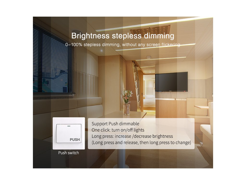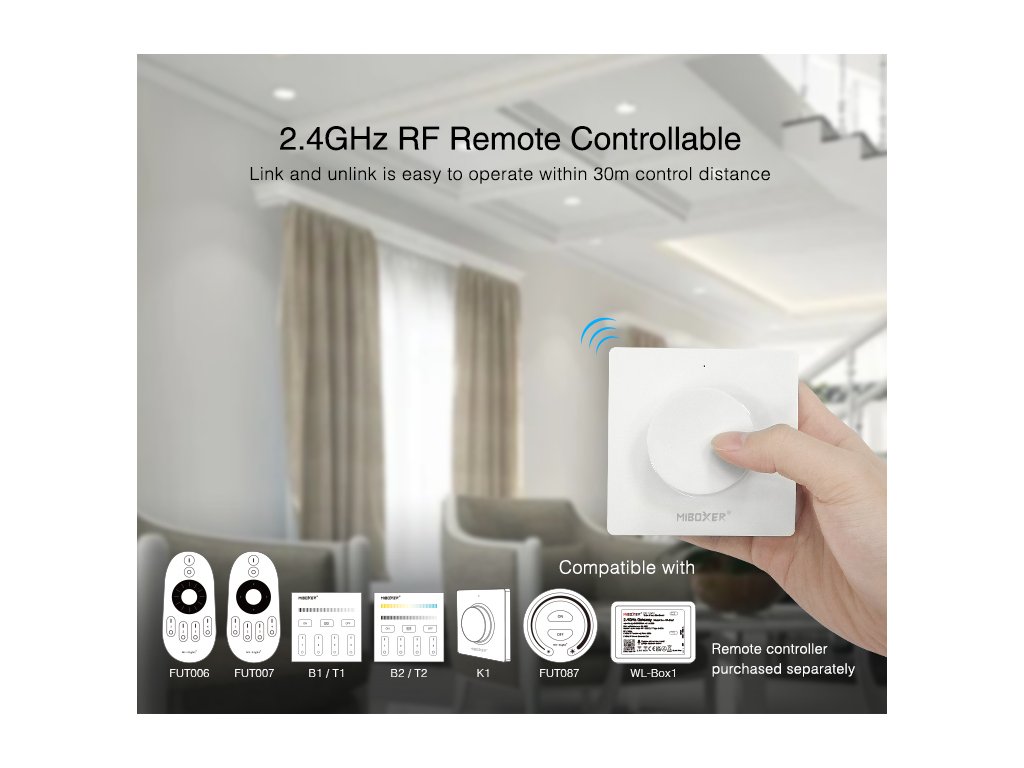 Stmievač/prijímač je kompatibilný iba s ovládačmi série Mi-Light. Je možné ho spárovať s jednofarebnými, CCT, RGB a RGBW ovládačmi Mi-Light.