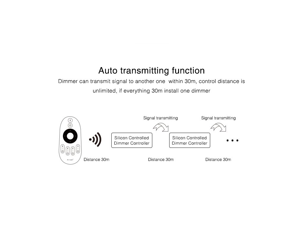 - Stmievač/prijímač pracuje na frekvencii 2,4 GHz, s dosahom až 30 m.
