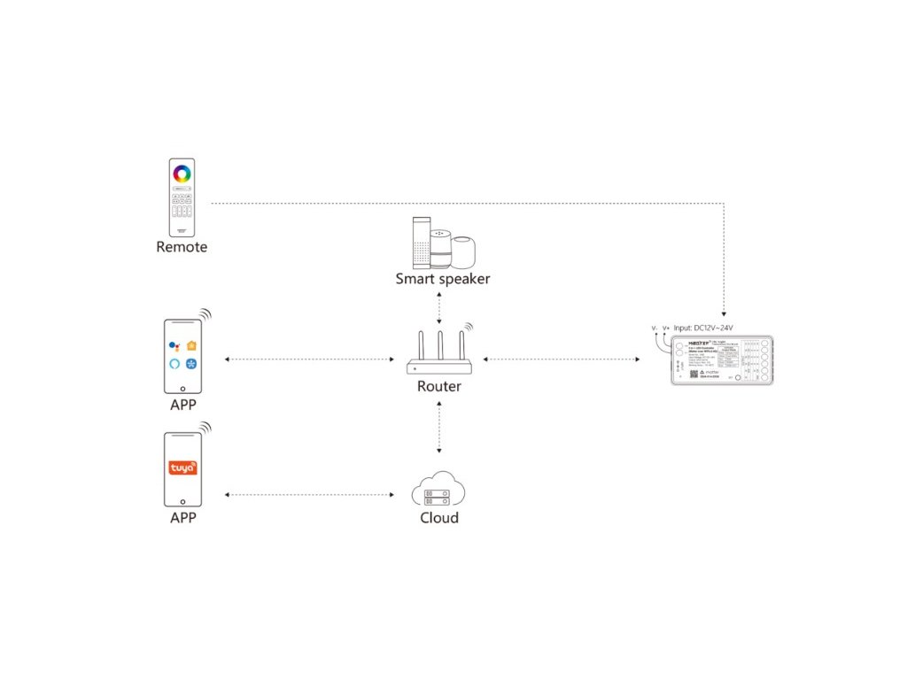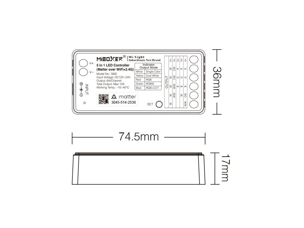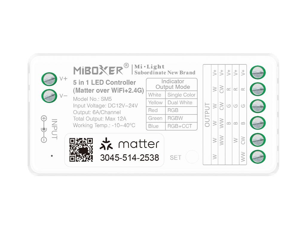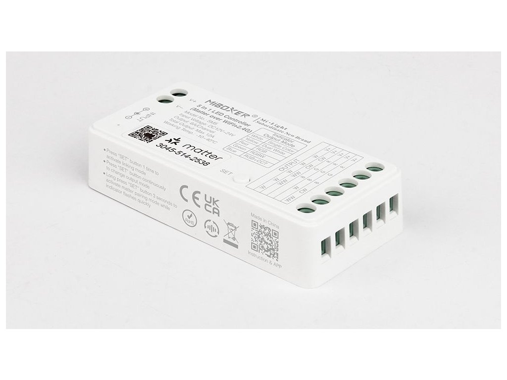 Prijímač pre LED produkty radu Mi-Light / MiBoxer, určený na ovládanie jednobarevných, CCT, RGB, RGBW a RGB+CCT LED pásikov v systémoch inteligentného osvetlenia. Prijímač sa zapája medzi napájací zdroj a LED pásik a umožňuje zapínanie, vypínanie, plynulé stmievanie, zmenu farieb aj reguláciu teploty bielej podľa typu pripojeného LED pásika.