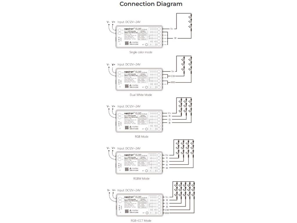 Prijímač podporuje viacero prevádzkových režimov podľa typu pripojeného LED pásika, vrátane jednobarevných, CCT, RGB, RGBW a RGB+CCT variantov. Voľba režimu sa vykonáva priamo na zariadení.