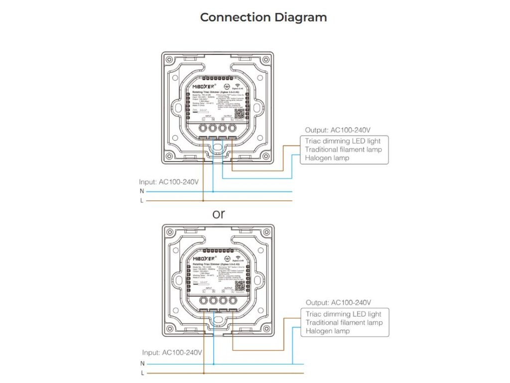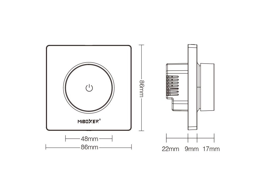 Otočný triakový stmievač a prijímač Mi-Light / MiBoxer je určený pre stmievateľné LED svietidlá a žiarovky napájané zo siete AC 230V. Ponúka možnosť ovládania ako diaľkovo prostredníctvom ovládačov radu Mi-Light, tak aj manuálne pomocou otočného kolieska. Stmievač/prijímač môže byť ukrytý (za stenou, sadrokartónom či v skrini), nie je nutná priama viditeľnosť prijímača pre ovládač.