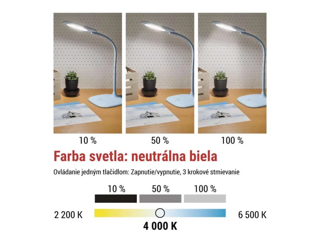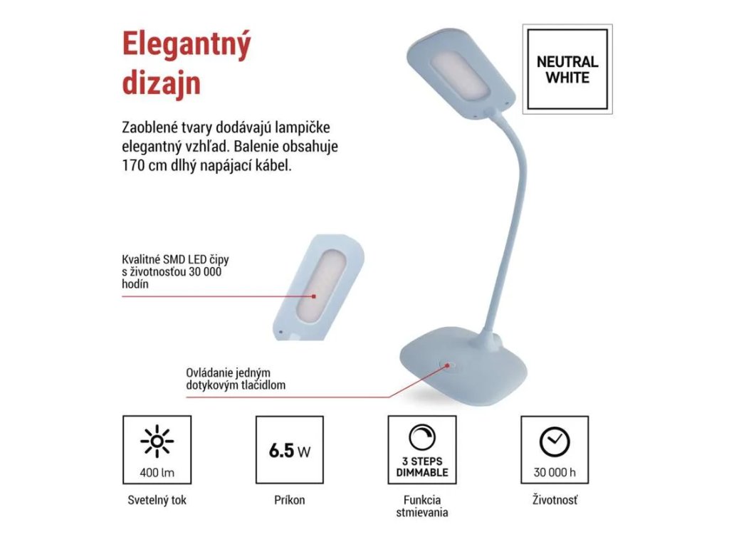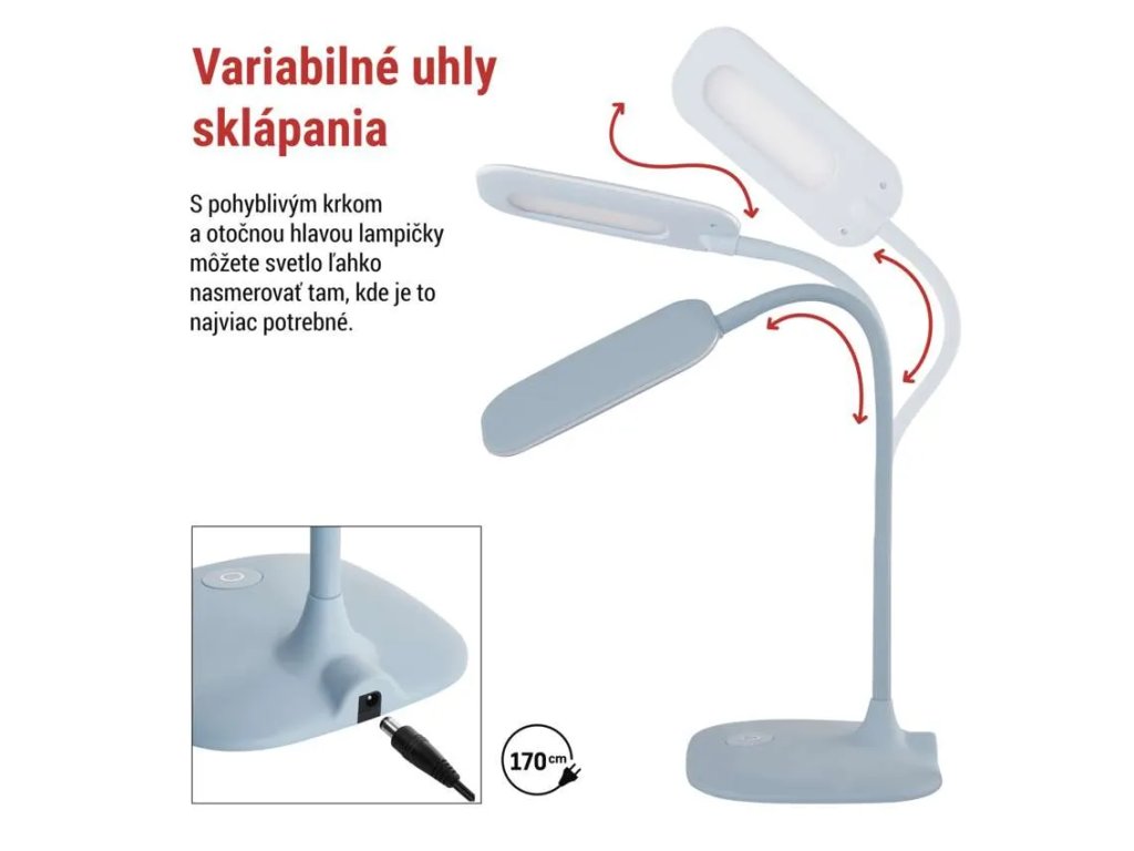 Modrá LED stolná lampička Stella je elegantným a praktickým riešením pre pracovný stôl, detskú izbu aj spálňu. Oblé tvary a jemné farebné prevedenie pôsobia moderne a nenápadne, vďaka čomu lampička ľahko zapadne do rôznych typov interiérov a nezaberá zbytočne veľa miesta.