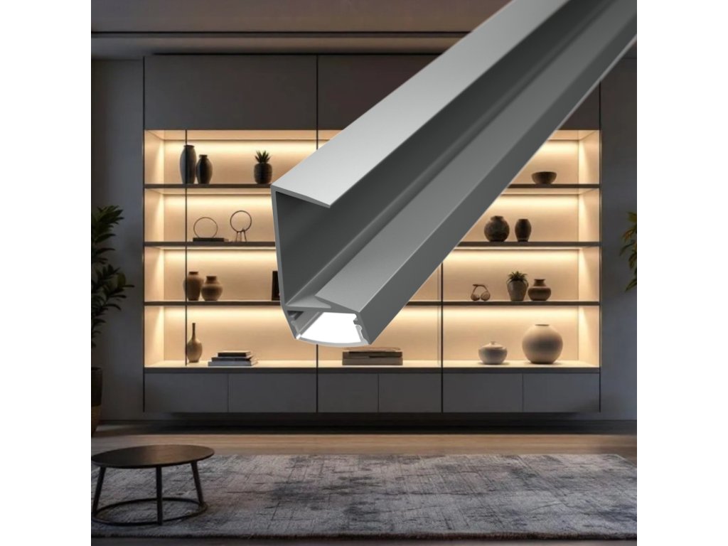 Štýlový a praktický hliníkový profil určený na nasvietenie políc a nábytku ponúka moderné a nenápadné riešenie osvetlenia pomocou LED pásikov. Ľahko sa nasúva priamo na drevené police s hrúbkou 18 mm a vďaka premyslenému uhlu svietenia 20° smerom dole efektívne zvýrazní priestor pod policou bez toho, aby rušil celkový vzhľad interiéru.