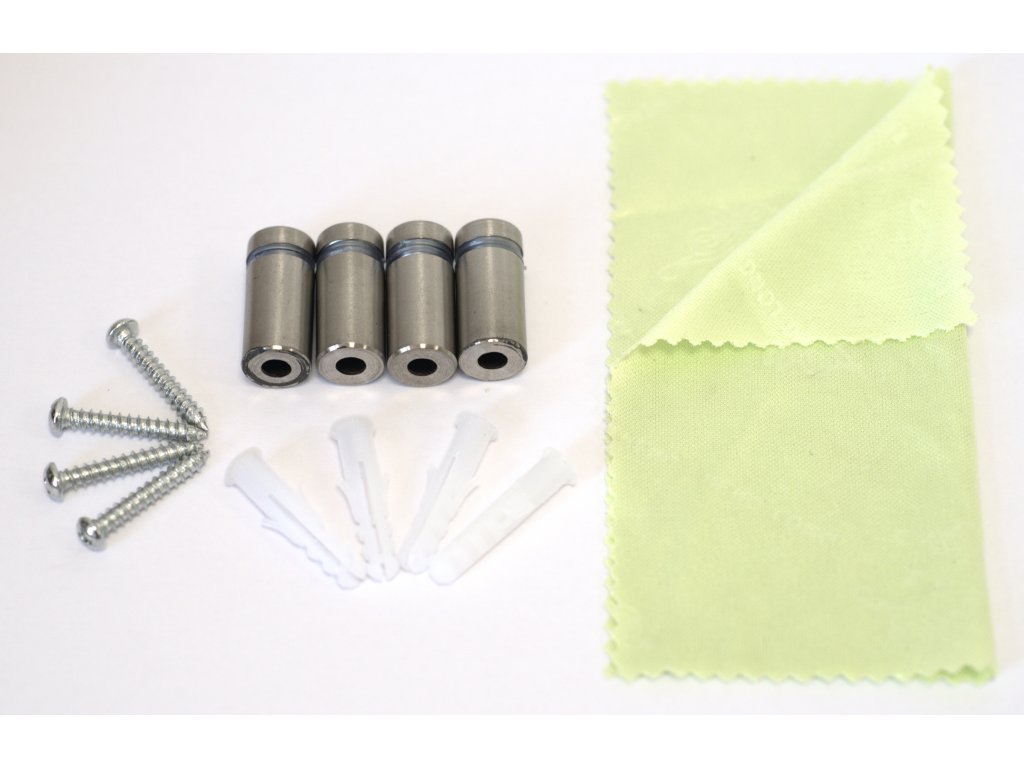montážna sada - dištančné úchyty, skrutky, hmoždinky, handrička z mikrovlákna, oceľové lanká pre možnosť zavesenia