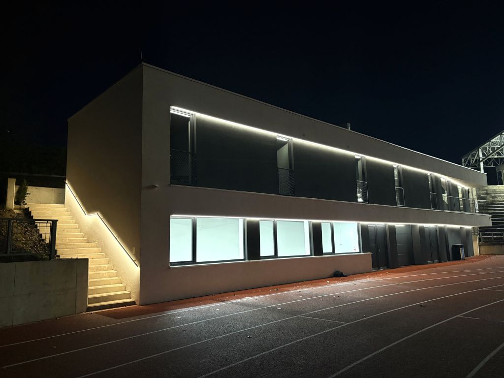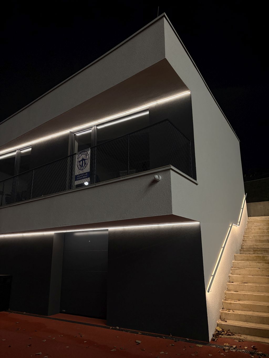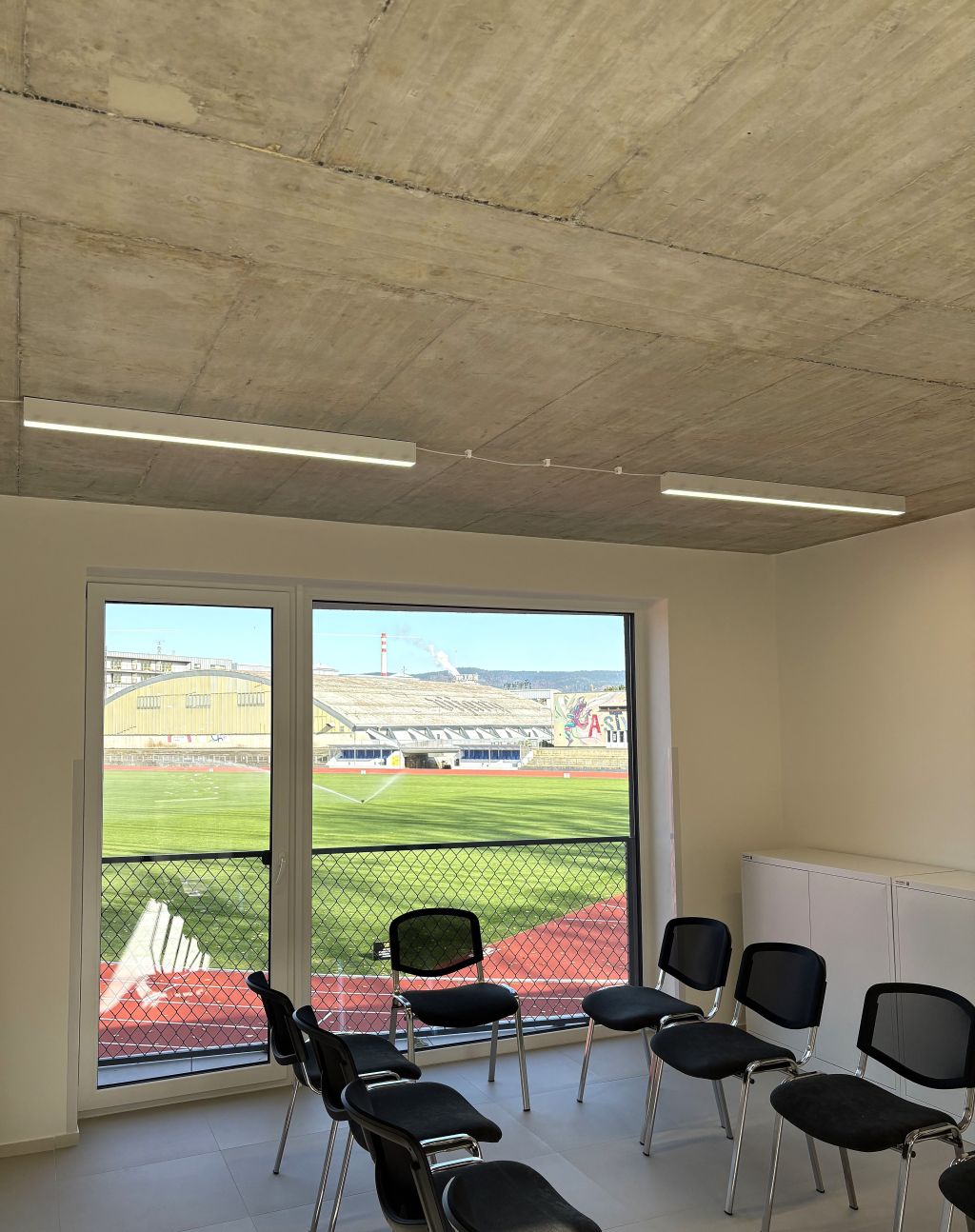 Použili sme kombináciu úsporných LED panelov a priemyselných svietidiel, ktoré zvládnu každodennú tréningovú záťaž aj vysokú vlhkosť v zázemí. Na vonkajšie osvetlenie budovy sme použili LED pásy s vysokým stupňom krytia a večer vďaka nim štadión žiari moderným a štýlovým dojmom.