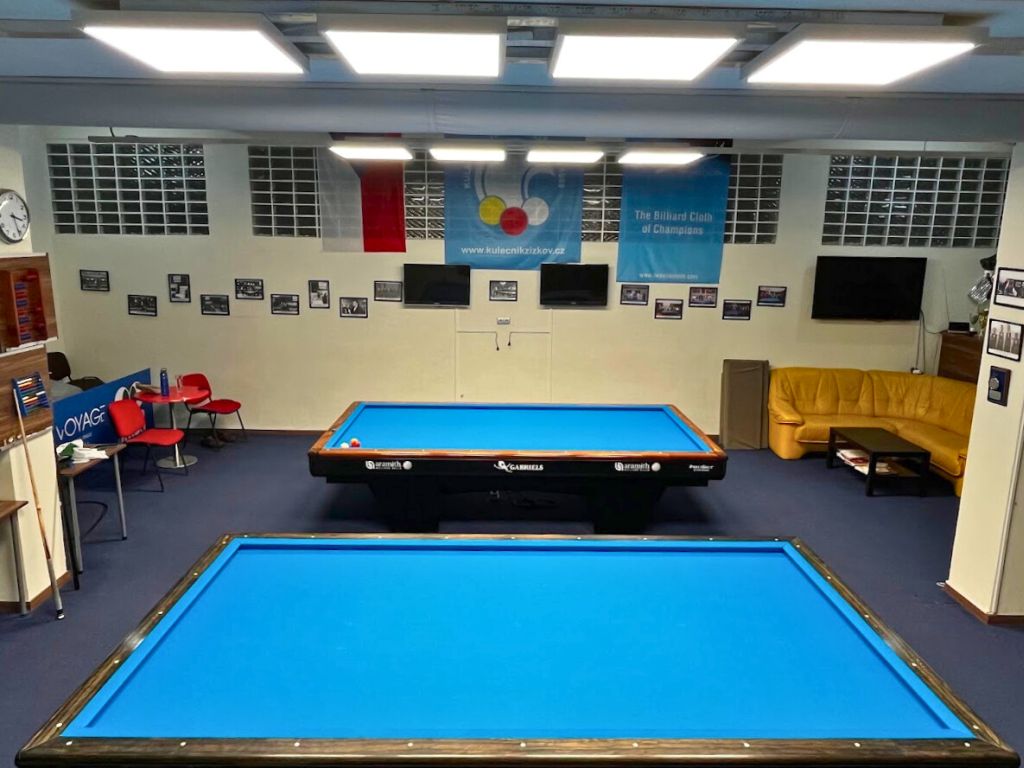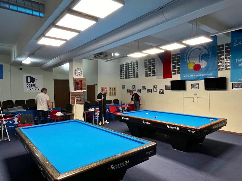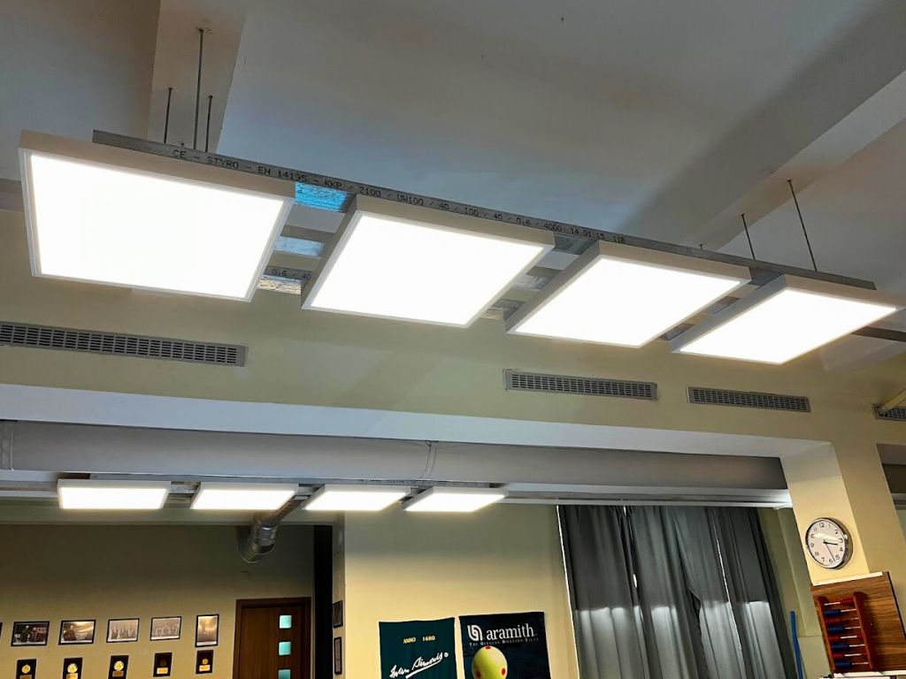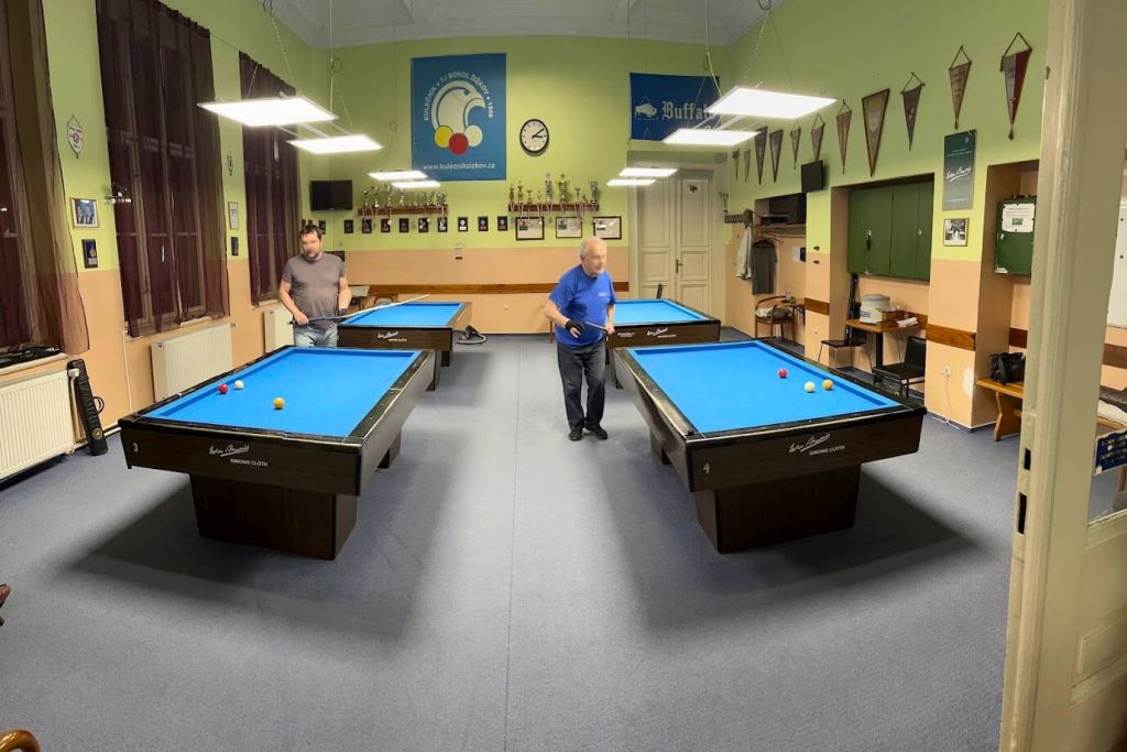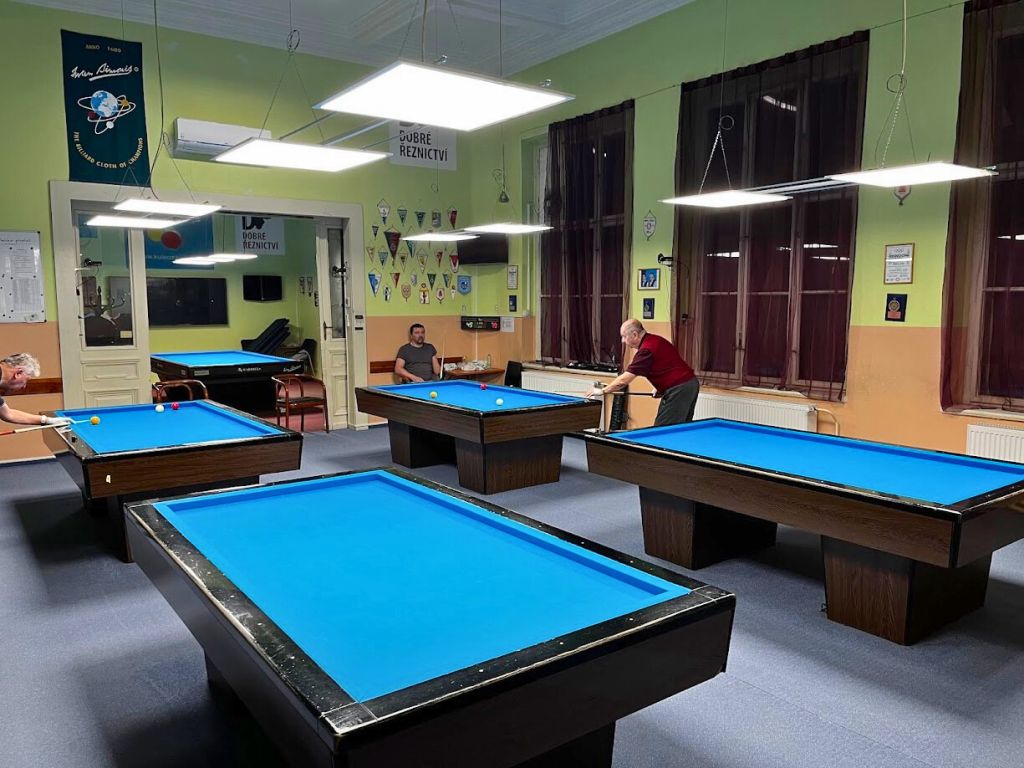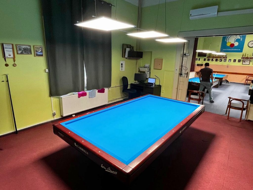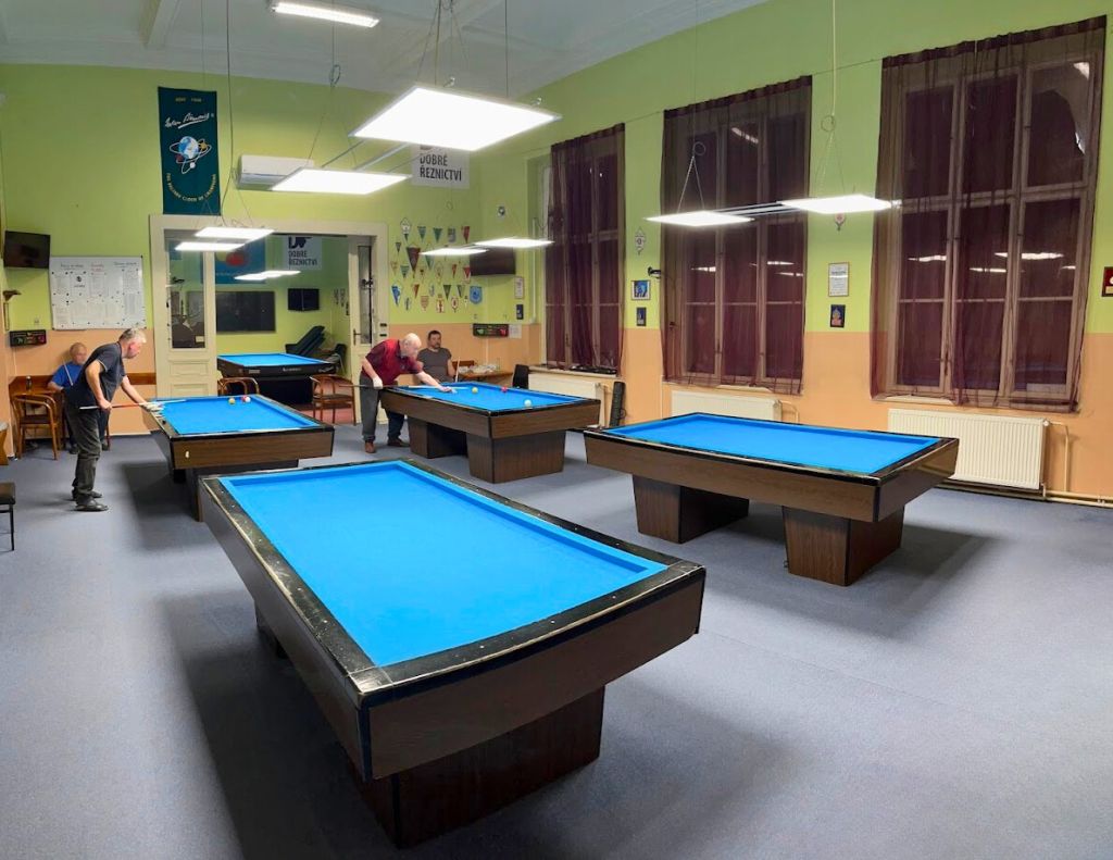 V biliardovom klube Karambol Žižkov v Prahe sme sa postarali o kompletnú modernizáciu osvetlenia všetkých troch herných miestností. Pôvodné LED trubice s chladným bielym svetlom (6500 K) sme nahradili kombináciou závesných a prisadených LED panelov typu UGR. Tieto panely majú mikroprizmatický kryt, ktorý zabezpečuje perfektný rozptyl svetla a eliminuje nepríjemné oslnenie – presne to, čo profesionálni hráči pri hre potrebujú. Nové osvetlenie s teplotou 4500 K poskytuje príjemnejšie a prirodzenejšie svetlo, ktoré zároveň spĺňa požadovanú svetelnú hladinu 750 lx, potvrdenú svetelným výpočtom.