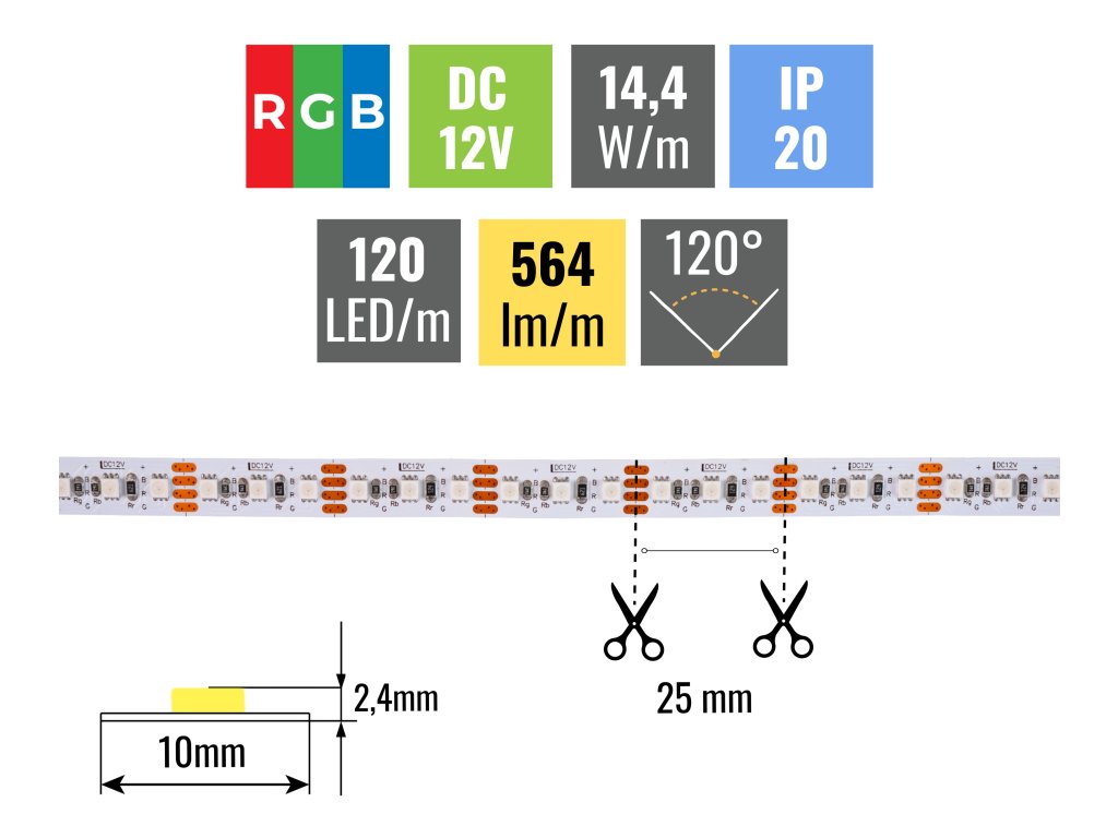 Z výkonu 14,4W/m RGB pásik vyprodukuje až 564lm/m. Hustota LED diód je 120ks/m, opasok vďaka tomu svieti rovnomerne po celej svojej dĺžke. Tento pásik je potrebné nalepiť do hliníkovej lišty z dôvodu odvodu tepla z LED diód. Všetky naše pásky sú vybavené samolepiacou fóliou 3M 300LSE, ktorá skvele priľne k podkladu. Ten musí byť hladký a je potrebné ho pred lepením poriadne odmastiť.