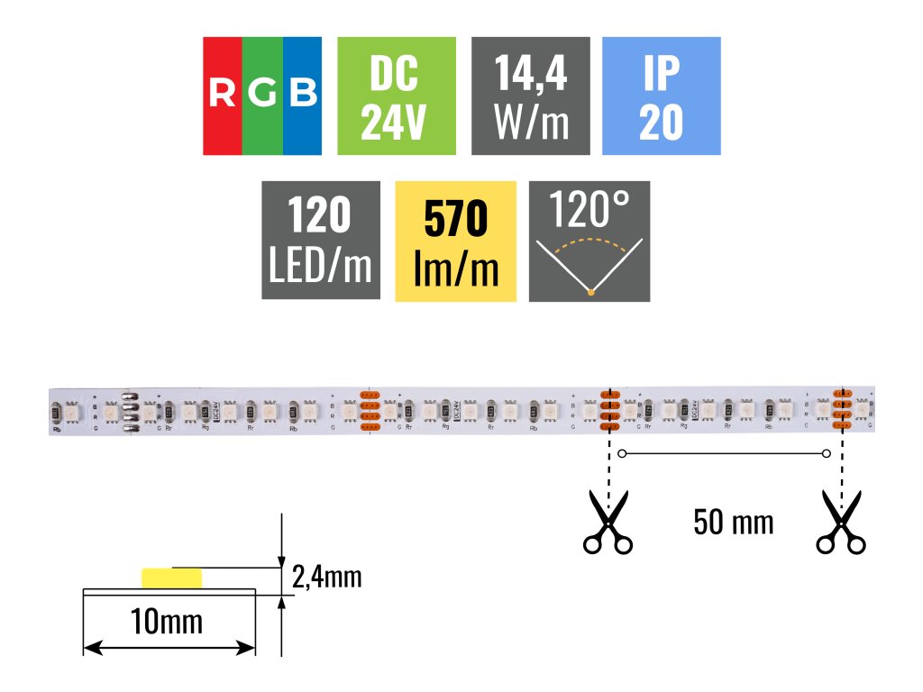 Z výkonu 14,4W/m RGB pásik vyprodukuje až 570lm/m. Hustota LED diód je 120ks/m, opasok vďaka tomu svieti rovnomerne po celej svojej dĺžke. Tento pásik je potrebné nalepiť do hliníkovej lišty z dôvodu odvodu tepla z LED diód. Všetky naše pásky sú vybavené samolepiacou fóliou 3M 300LSE, ktorá skvele priľne k podkladu. Ten musí byť hladký a je potrebné ho pred lepením poriadne odmastiť.