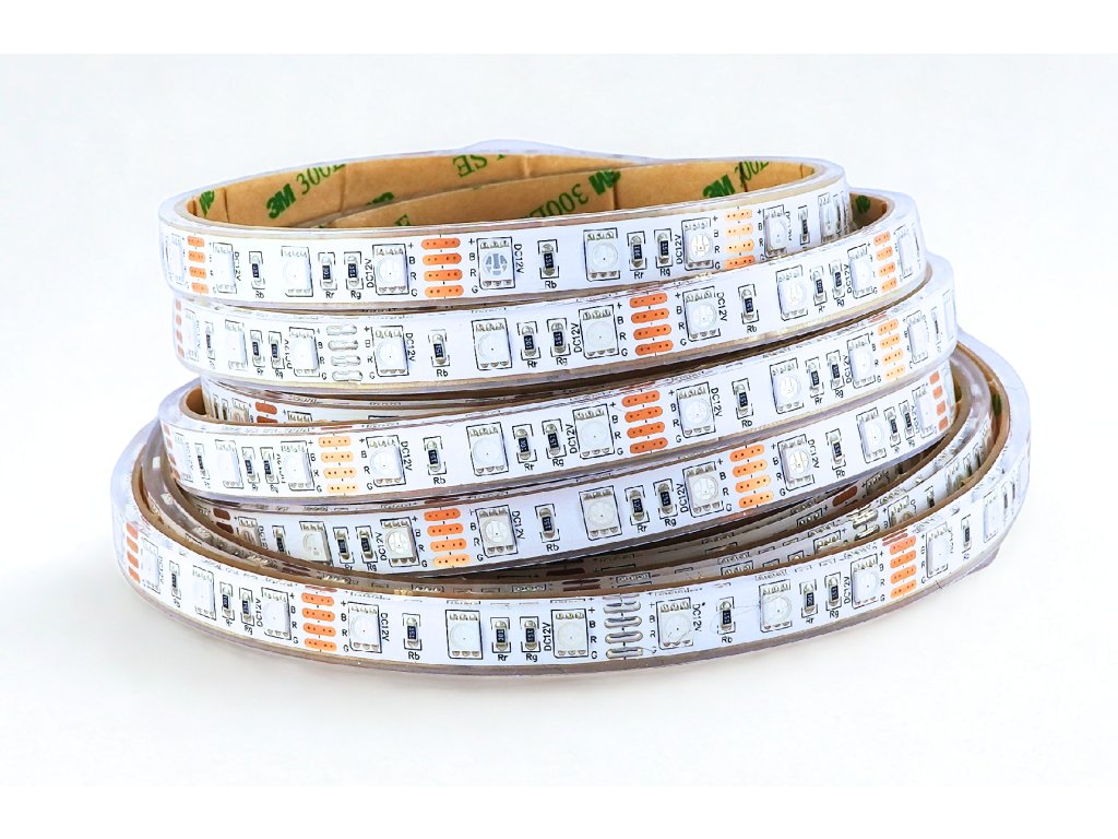 Z výkonu 14,4W/m RGB pásik vyprodukuje až 588lm/m. Hustota LED diód je 60ks/m, opasok vďaka tomu svieti rovnomerne po celej svojej dĺžke. Tento pásik je potrebné nalepiť do hliníkovej lišty z dôvodu odvodu tepla z LED diód. Všetky naše pásky sú vybavené samolepiacou fóliou 3M 300LSE, ktorá skvele priľne k podkladu. Ten musí byť hladký a je potrebné ho pred lepením poriadne odmastiť.