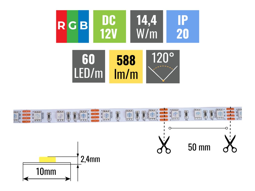 Z výkonu 14,4W/m RGB pásik vyprodukuje až 588lm/m. Hustota LED diód je 60ks/m, opasok vďaka tomu svieti rovnomerne po celej svojej dĺžke. Tento pásik je potrebné nalepiť do hliníkovej lišty z dôvodu odvodu tepla z LED diód. Všetky naše pásky sú vybavené samolepiacou fóliou 3M 300LSE, ktorá skvele priľne k podkladu. Ten musí byť hladký a je potrebné ho pred lepením poriadne odmastiť.