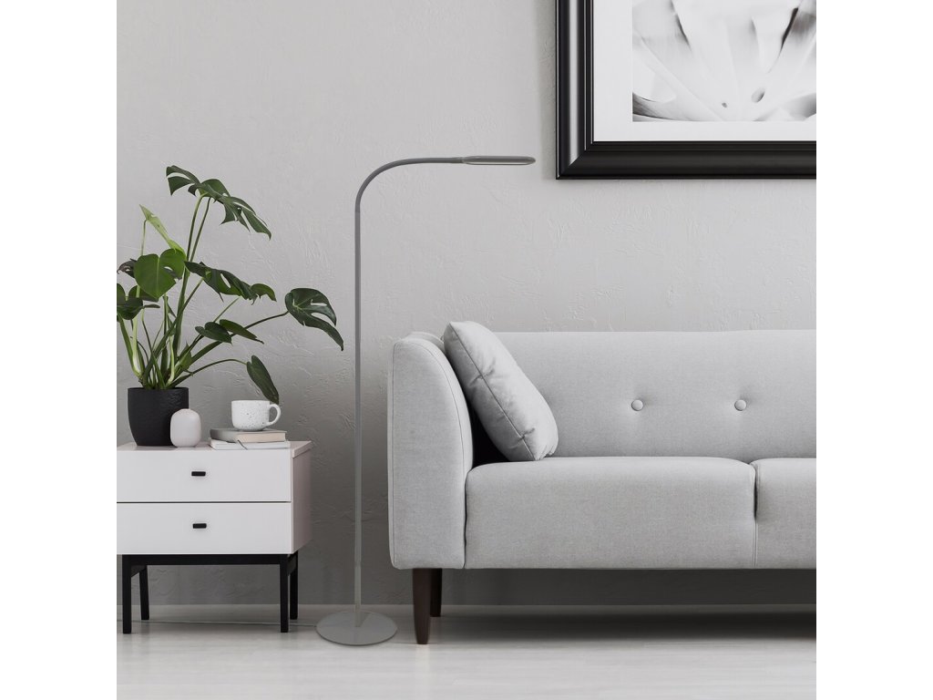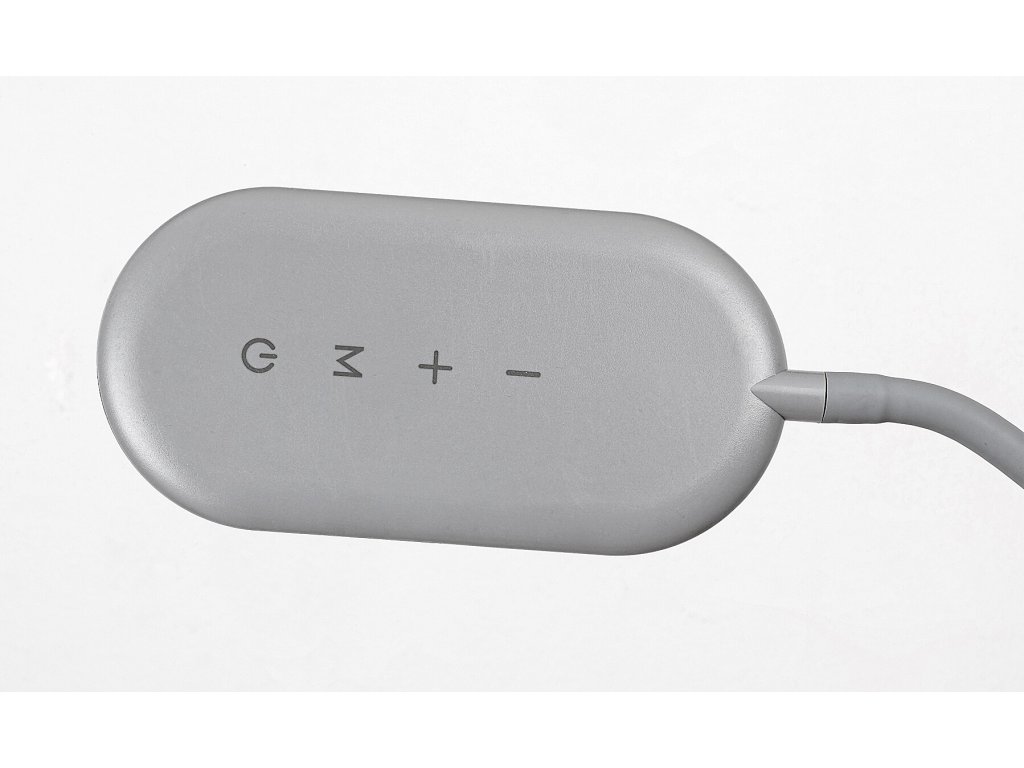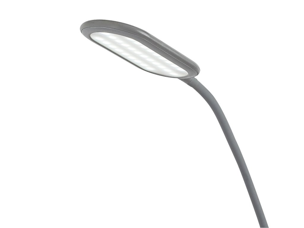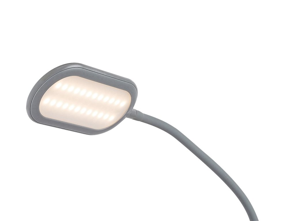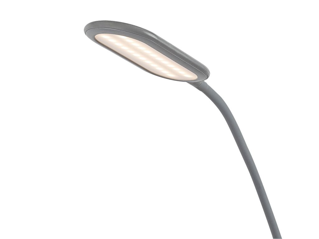 Šedé kovové telo dopĺňa elegantne zakrivená stonka, ktorá plynule prechádza v plochú hlavicu so zabudovaným LED svetelným zdrojom. Biele plastové tienidlo zaisťuje rovnomerné rozptýlenie svetla, zatiaľ čo okrúhla základňa poskytuje lampe stabilitu.