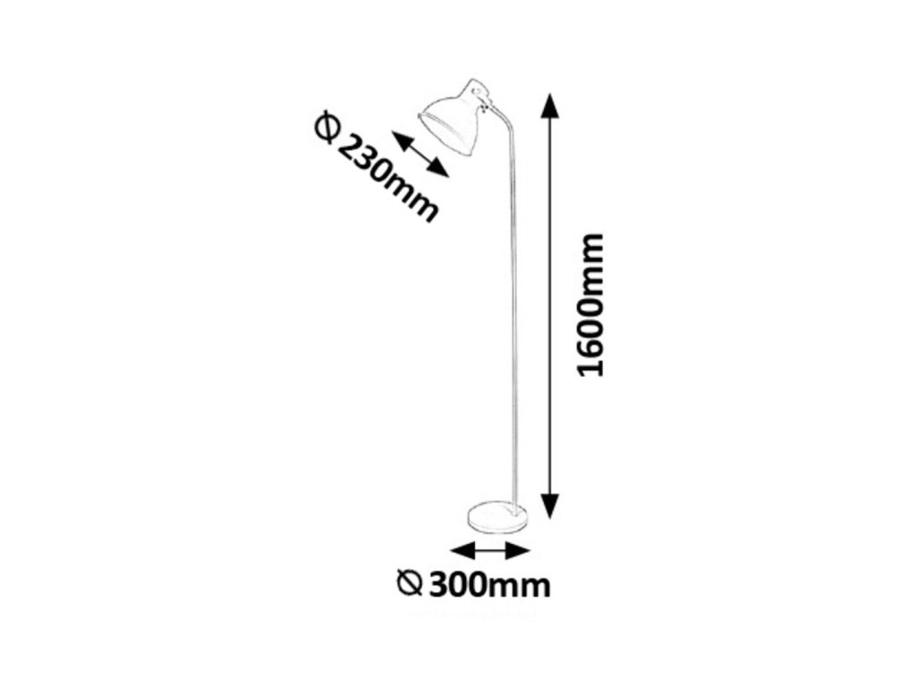 Výška lampy dosahuje 1600 mm, priemer tienidla je 230 mm a priemer základne 300 mm.