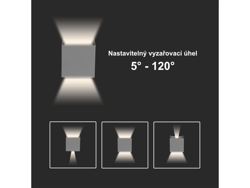 Moderné fasádne LED svietidlo s výkonom 5W je určené do akéhokoľvek interiéru alebo exteriéru. Hlavnou výhodou je vizuálne zaujímavý efekt svetla, ktorý je možné vytvoriť za pomoci nastavenia uhla svetelných lúčov. Za pomoci krycích klapiek si sami môžete meniť vyžarovanie uhol v rozsahu 5°-120° a to ako z dolnej, tak aj z hornej časti svietidla. Vďaka krytiu IP65 je možné svietidlo použiť na nasvetľovanie vonkajších fasád.