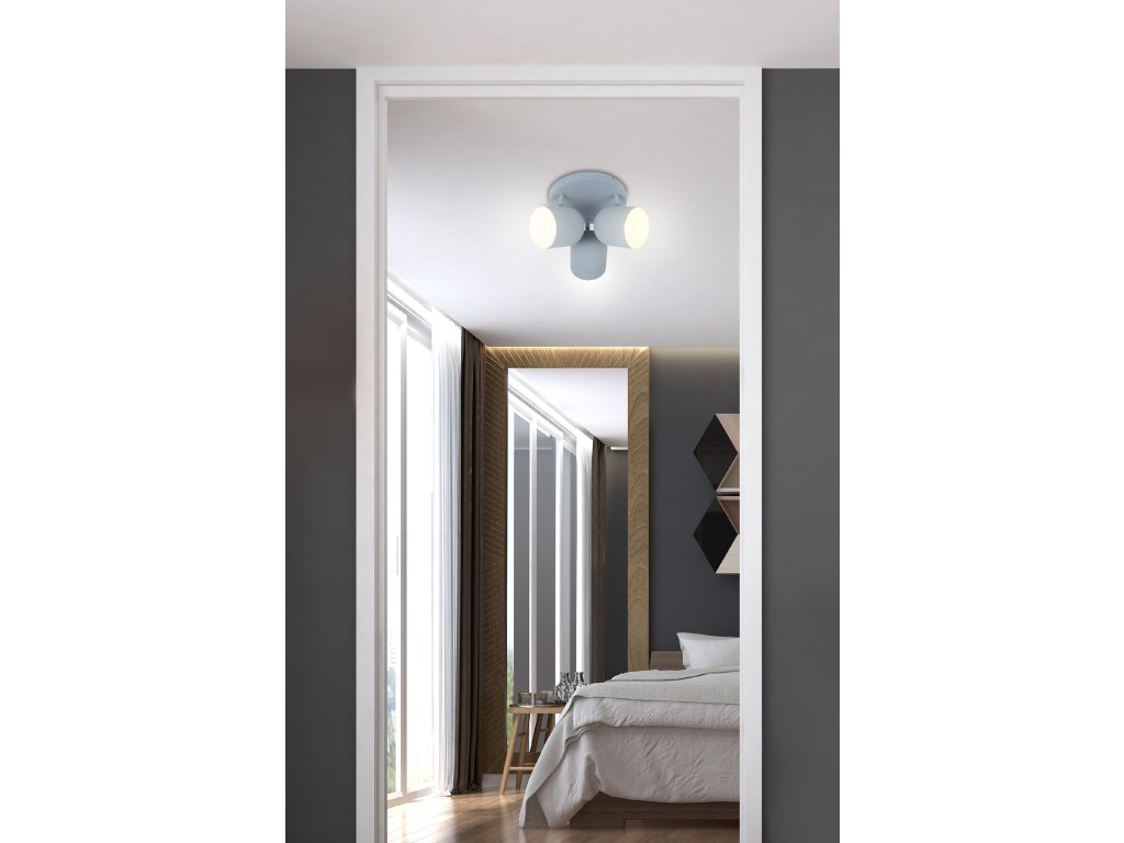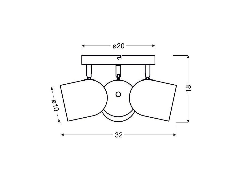 Stropné LED svietidlo s päticami 3x E27 s výkonom max. 40W. Rozmer tohto svietidla je ø320x180mm. Svietidlo je vhodné do moderného interiéru. Výhodou je možnosť nastavenia sklonu tienidla vertikálne aj horizontálne. Svietidlo je vyrobené z kovu šedej matnej farby.